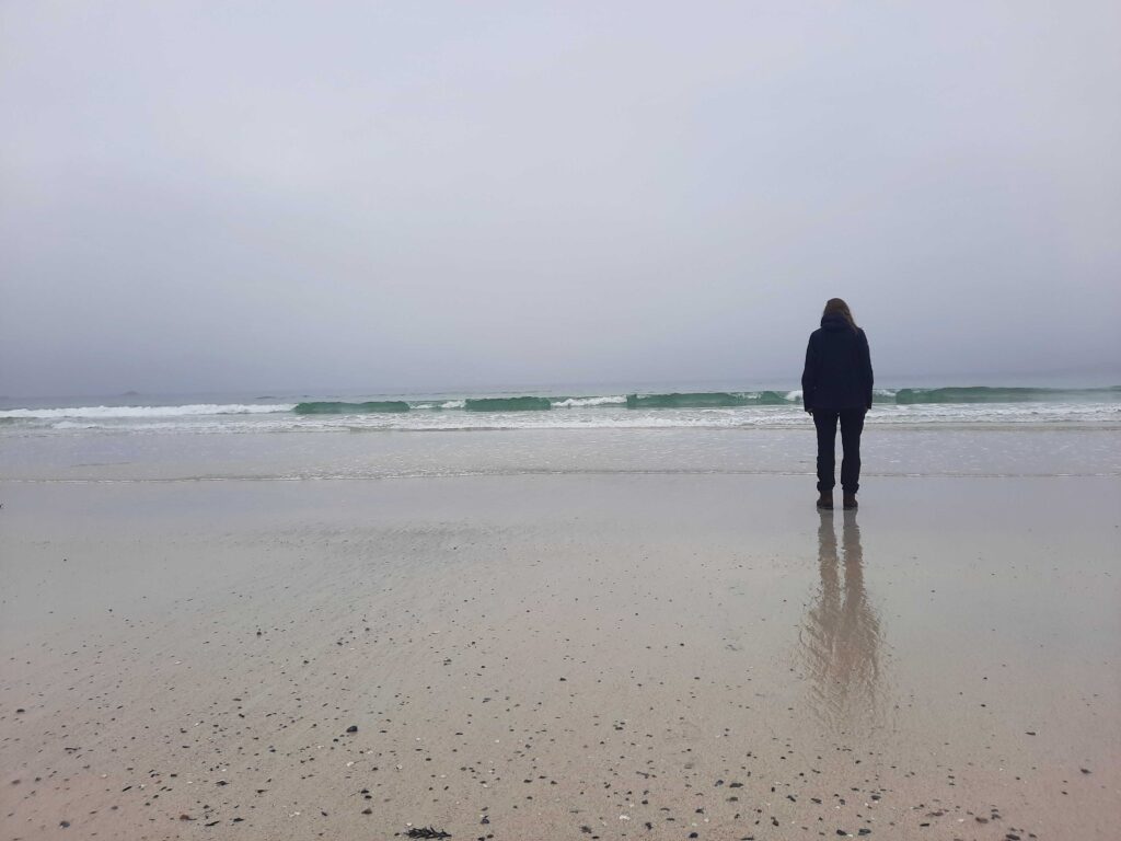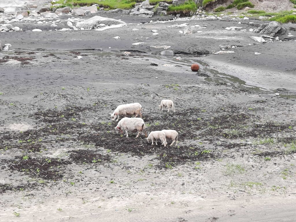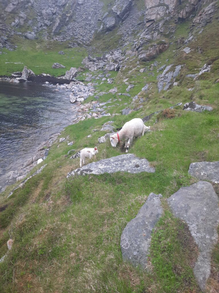 Od parkoviště je cesta přibližně 2 km, což je na první pohled pohoda. Vzhledem ke krosnám a převýšení, jsme šli tempem 32 min na km (rychlá chůze je asi 12 min na km). Na pláži je zase spousta ovcí, které jsou z naší přítomnosti stejně nenadšené, jako my z té jejich.