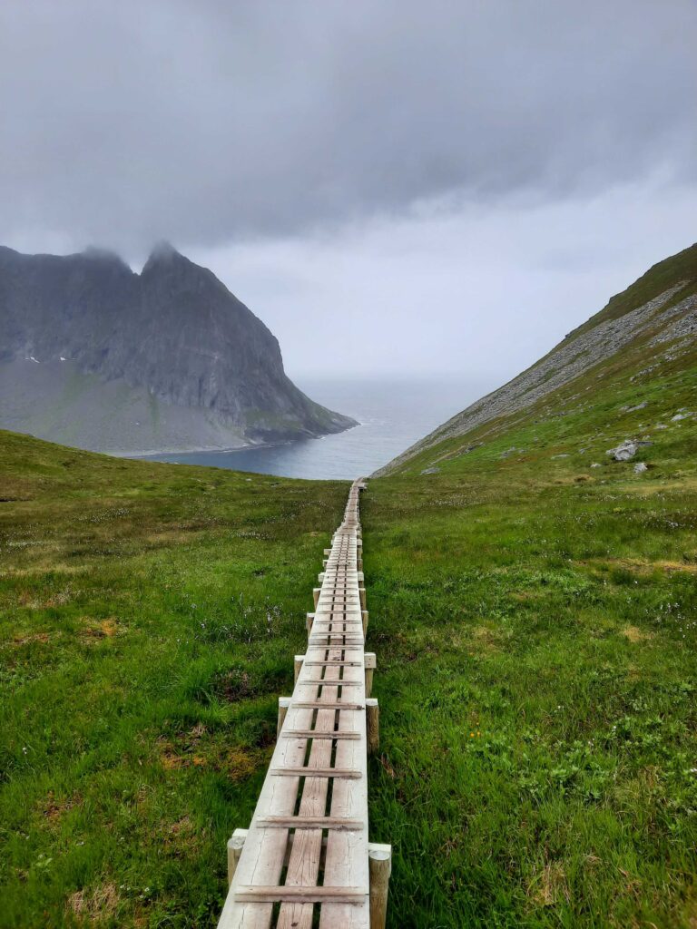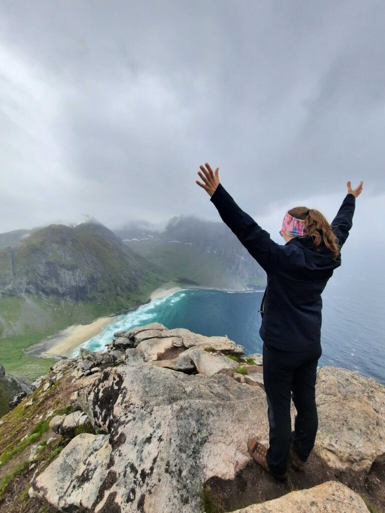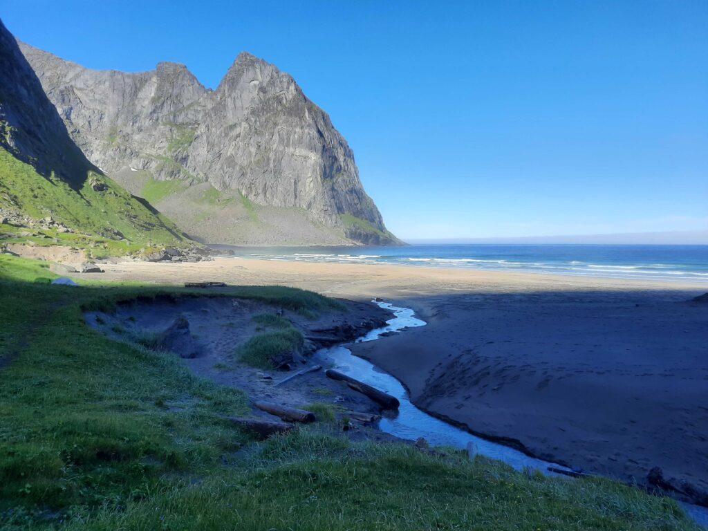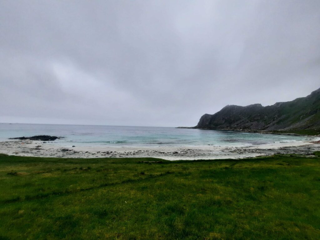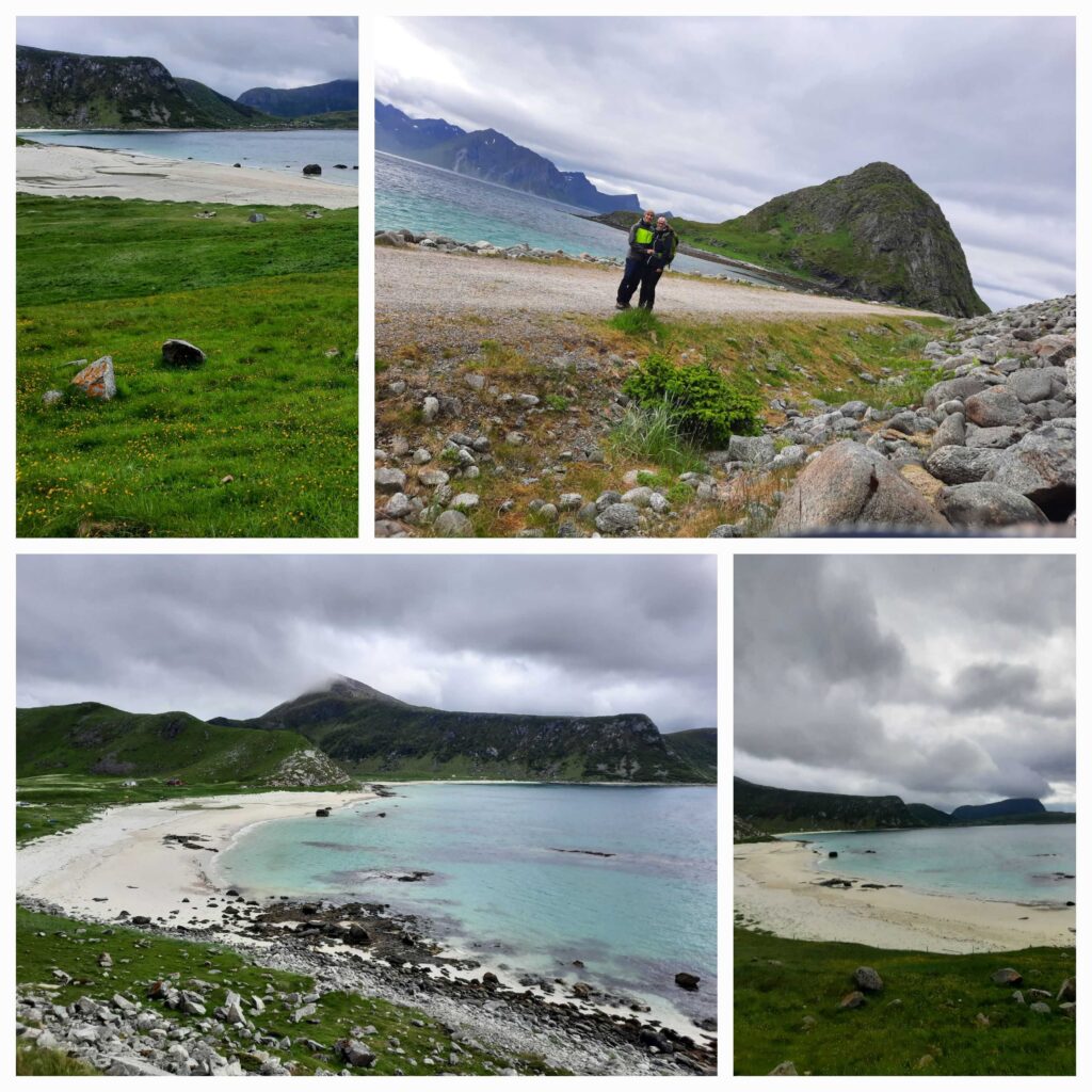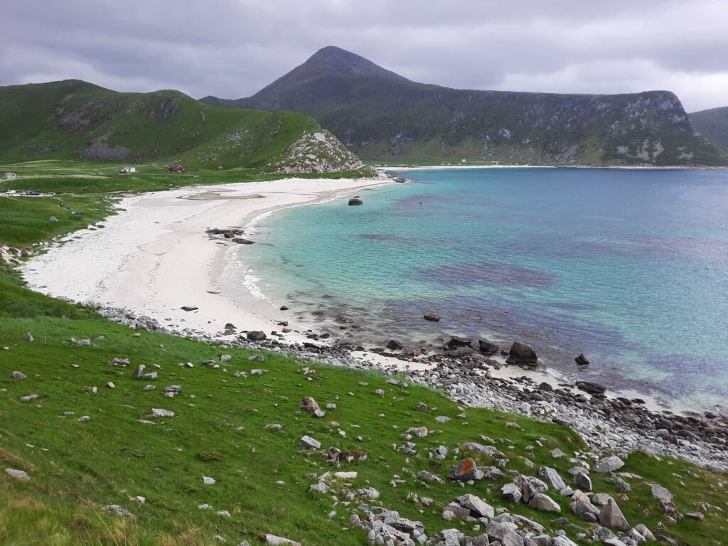 Obcházíme výběžek ostrova z Hauklandstranda do Uttakleivstranda a zpět. Celou cestu obdivujeme střídavě pláže, které jsou zde bílé, moře, které je kvůli písku krásně světle modré, a horu, která vyrostla z 0 metrů až do 500 nad mořem.