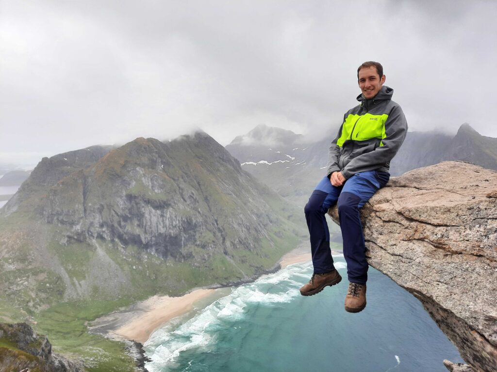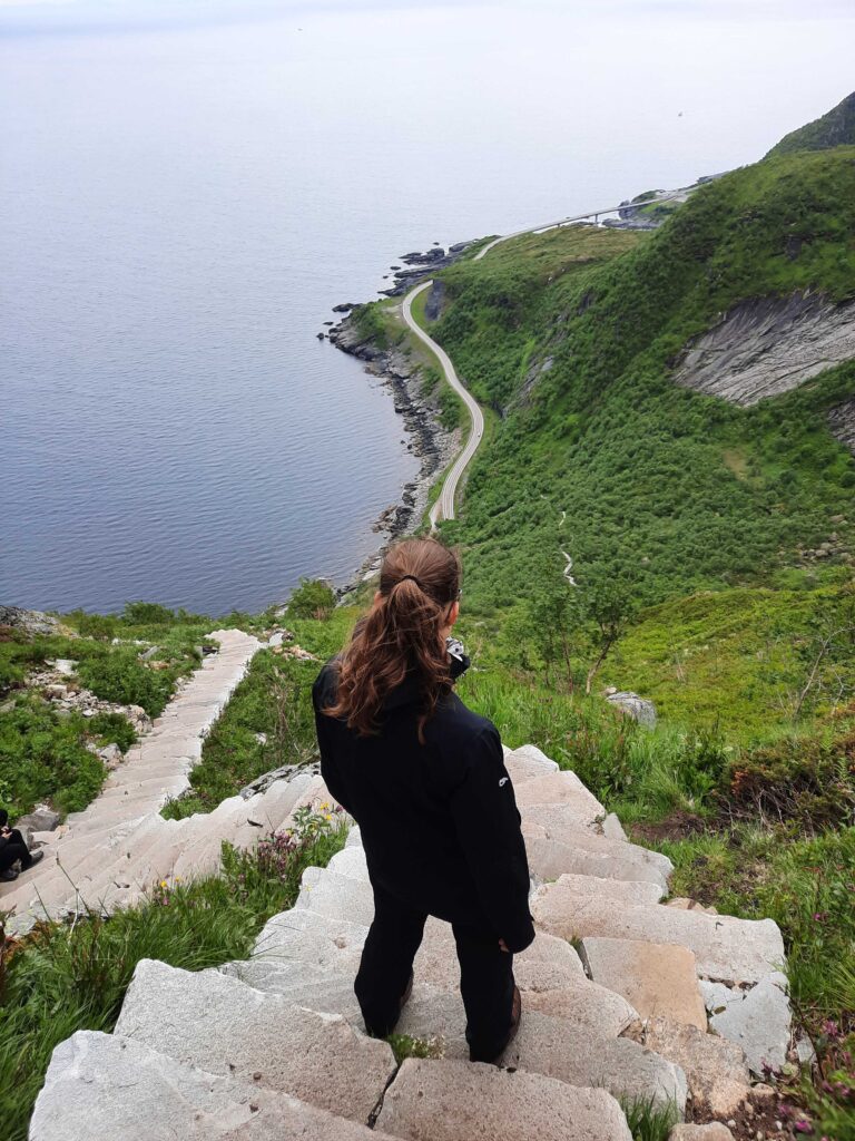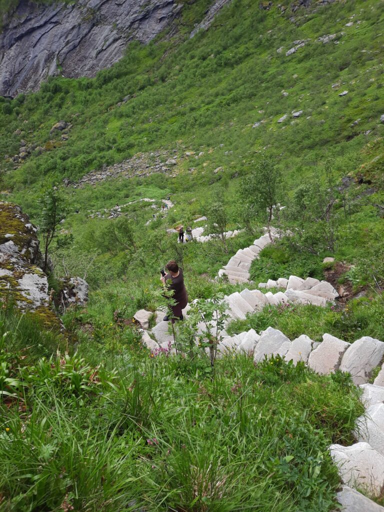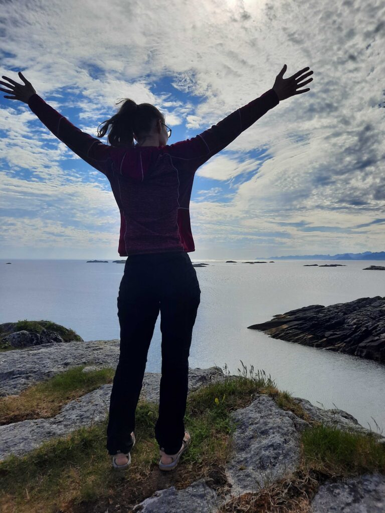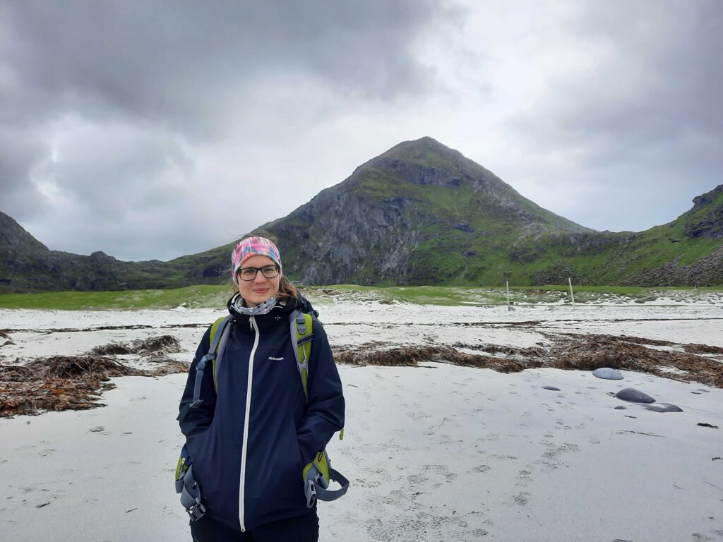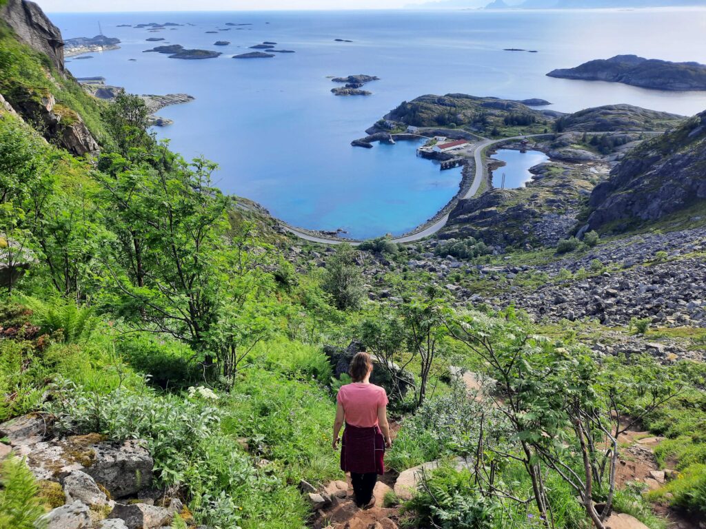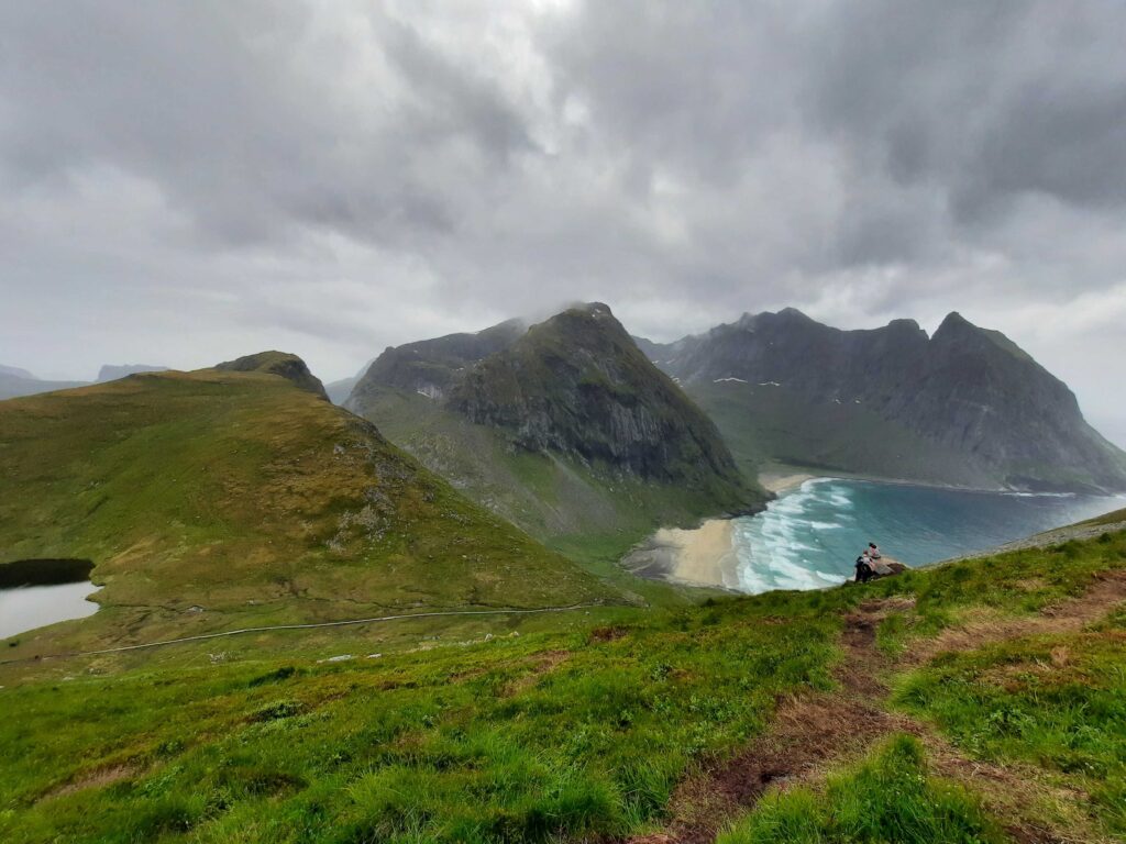 Obcházíme výběžek ostrova z Hauklandstranda do Uttakleivstranda a zpět. Celou cestu obdivujeme střídavě pláže, které jsou zde bílé, moře, které je kvůli písku krásně světle modré, a horu, která vyrostla z 0 metrů až do 500 nad mořem.