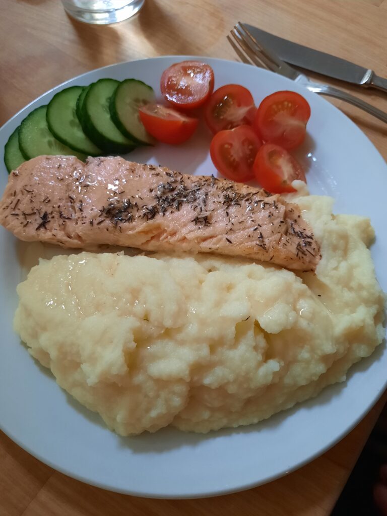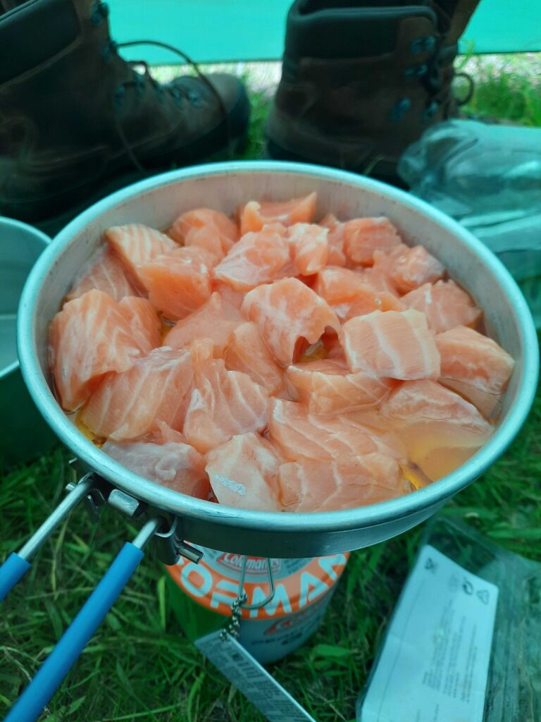 Po odpočinku jsme postavili stan a na večeři jsme si dali lososa s bramborovou kaší. Tu jsme teda nevařili, je z prášku od Knorr a teda na to, ze je z prášku, je skvělá. Celá večeře byla skvělá.