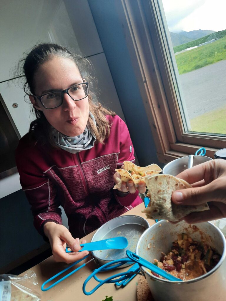 Závěr dne máme ve vesnici Flakstad, v kempu Skagsanden beach. Původní plán byl jen zaplatit sprchu a konečně se pořádně umýt (ano, až dnes), ale nakonec jsem se podvolil a v kempu i spíme. Varianta je to v závěru dost dobrá, protože máme wifi a hlavně pořádnou kuchyňku. Kemp jsme si nejprve prošli, našli místo na stan a šli vařit. Máme variaci na tacos (tortily) plněné zbytkem lososa a směsí zeleniny a fazolí (což je taky zelenina, ale chtěl jsem to zdůraznit, ve stanu bude teplo :D).