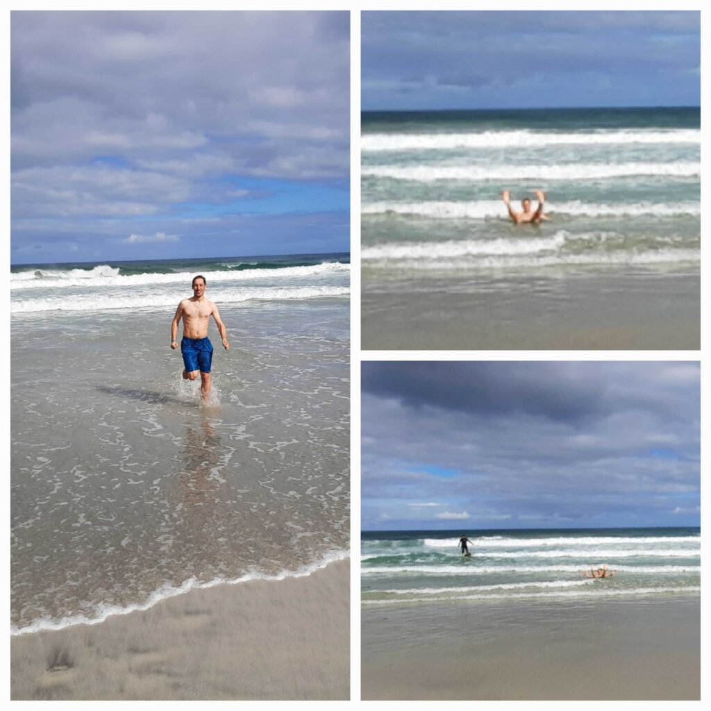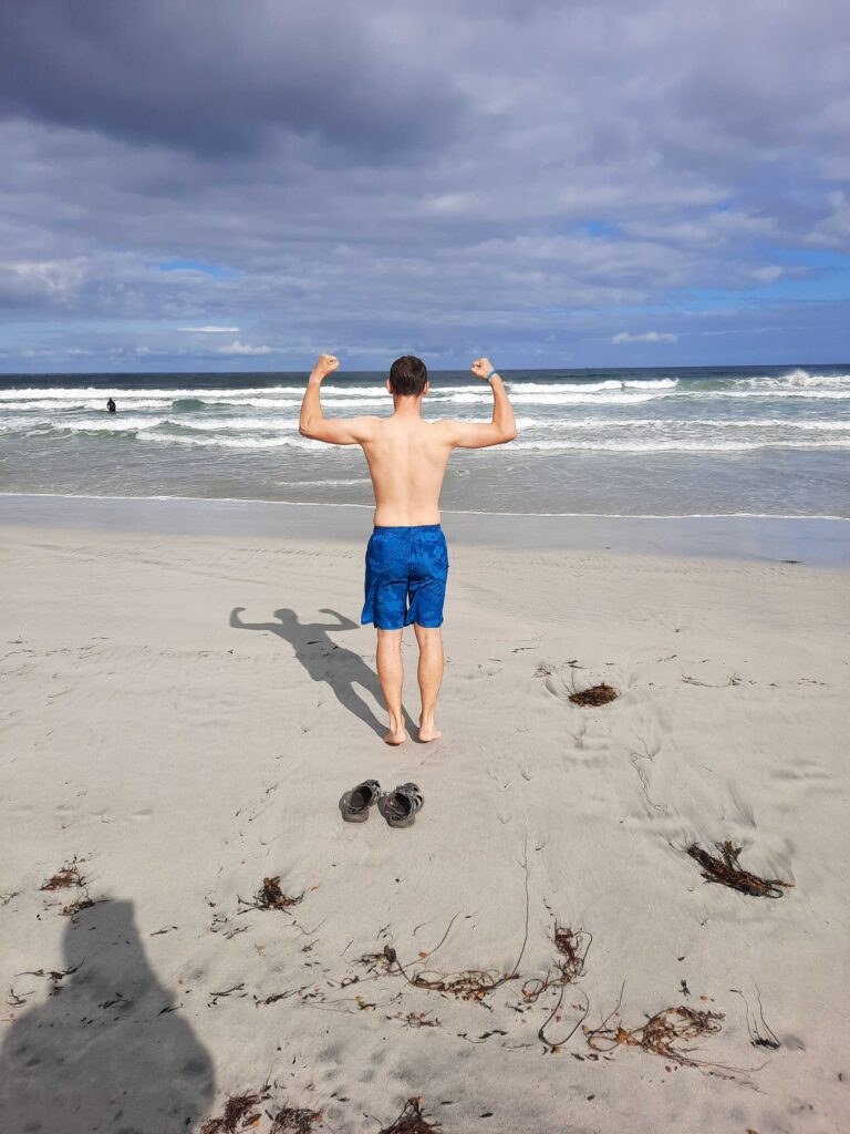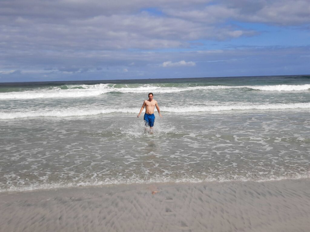 Teda vlezl jsem tam až na druhý pokus. Nejdřív jsem tam vběhl a vyběhl ven, protože voda byla tak studená, že nohy mě poslouchaly jen instinktivně. Já je necítil. Venku z vody jsem ale zjistil, že to najednou taková hrůza nebyla a hlavně, že nemám fotku a šel jsem znovu. Sedl jsem do vlny a vymáchal se. ZIMAAAA.