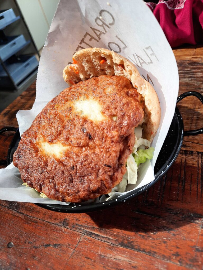 Na pozdní oběd tak máme tradiční rybí placku (měla by to být místní treska) se salátem v housce, kafe a horkou čokoládu.