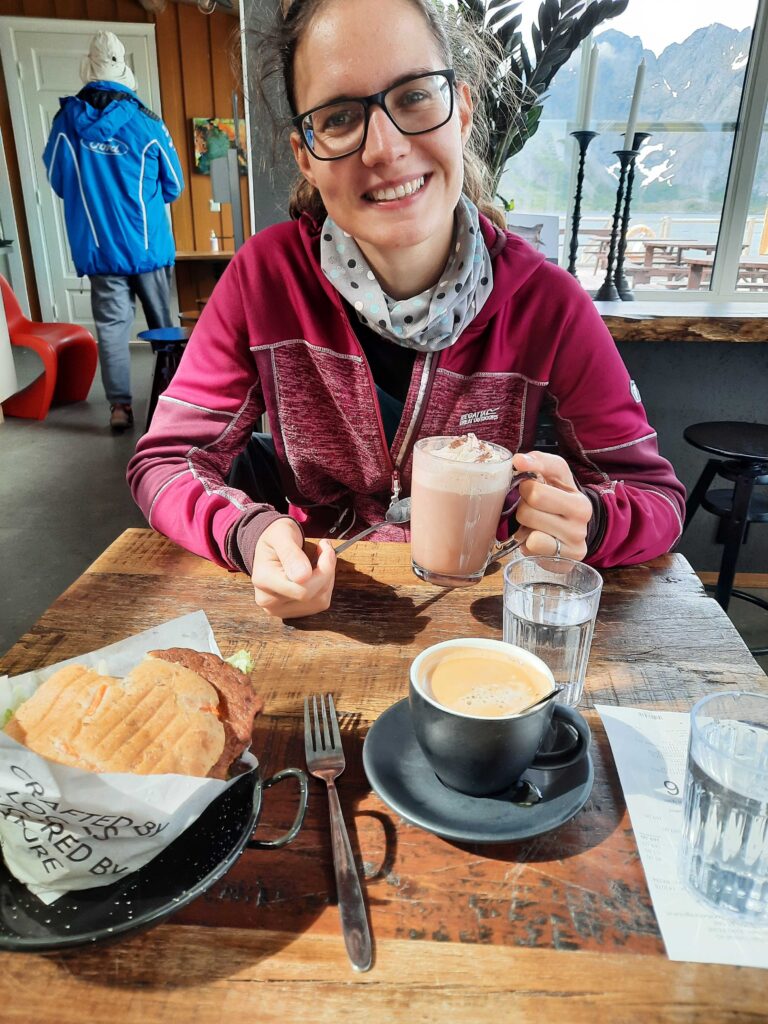 Další plán je jet do Å. Nakonec ale podléháme ještě jednomu objevu z internetu a kousek se vracíme. Navštěvujeme Anita’s Sjømat, což je lokální obchůdko-bistro, kde prodávají vše norské, vše lofotské, vše drahé a hlavně taky mňamky z ryb a burgry s rybami.