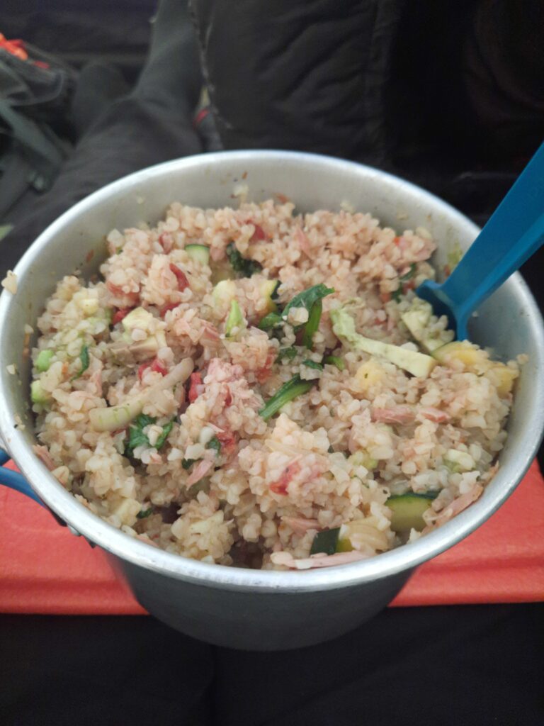 V postaveném stanu jsme asi hodinu polehávali a pak si dali Martinův kouzelný ešus (rýže, žampióny, cuketa, rajče, vysočina, cibule a kousek avokáda). Mňam, jen jsme vzali málo vody, takže zítřejší snídaně bude mít mastná oka od večeře, no co už. Vařili jsme v předsíňce v zátiší pohorek.