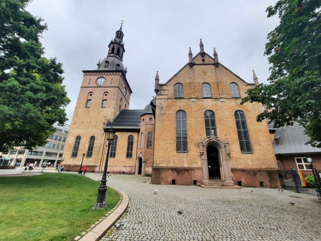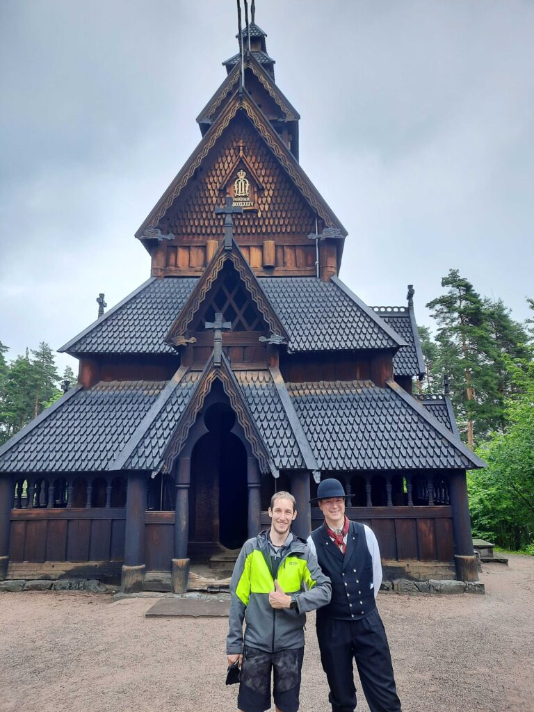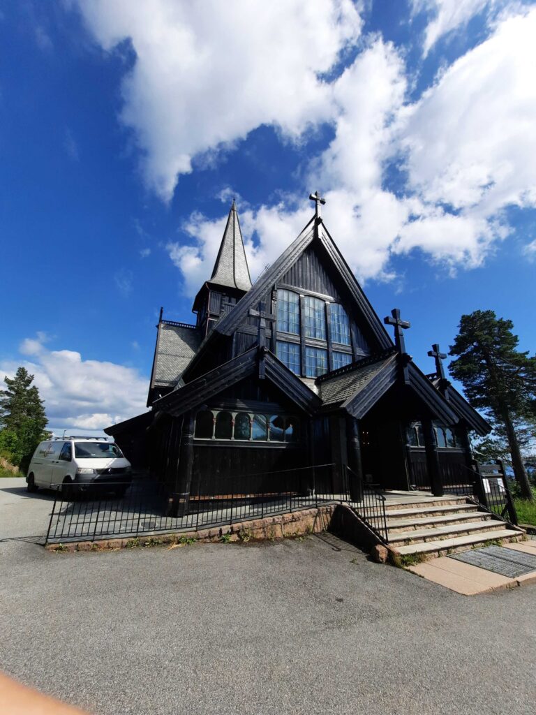 Z Holmenkollenu jsme po nebo kolem jezdeckých drah vyrazili dál. Byli jsem docela překvapení, jak areál žije i v létě. Hodně „lyžařů“ trénovalo okruhy a dávali kolečka na kolečkových lyžích. Třeba jsme potkali nějakého norského nástupce po bratrech Boe. Kousek nad tratí je i krásný kostel, kam jsme rychle zamířili a který Marťa málem nevyfotil.