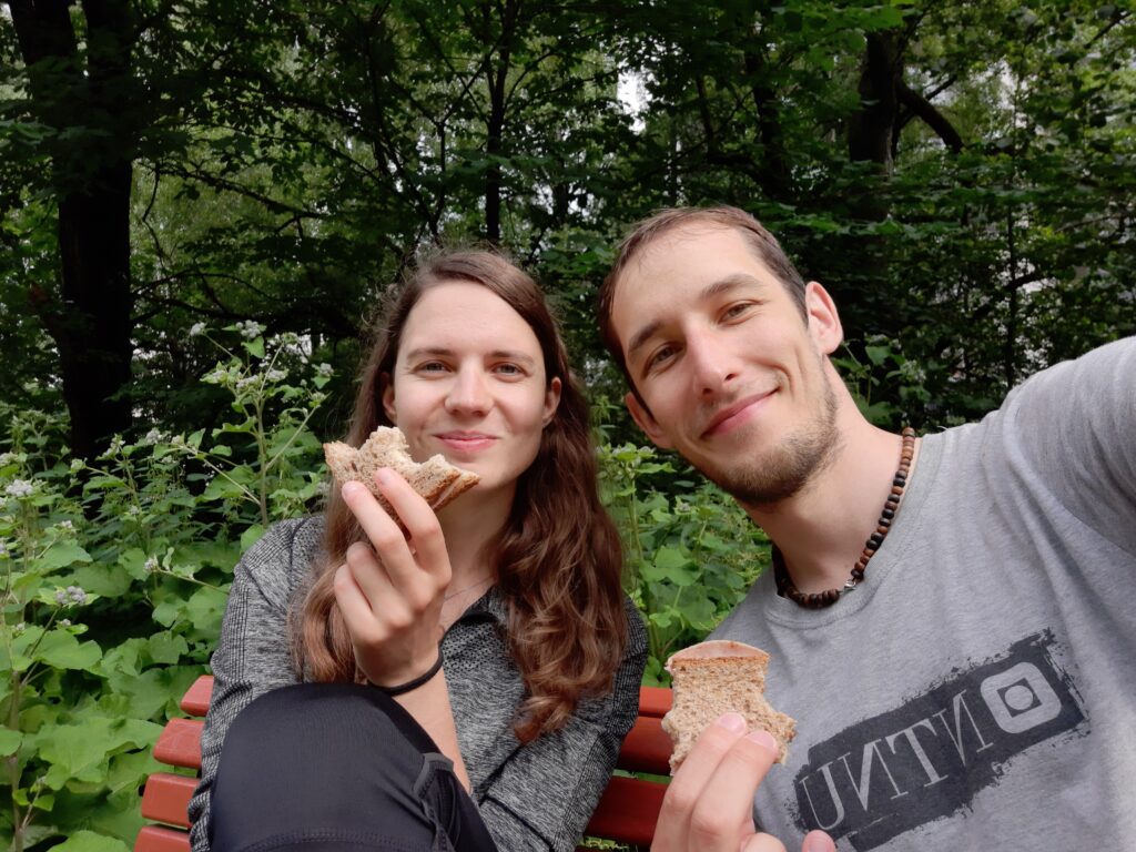 Teda to byla odměna hlavně pro Týnu. Mají je tu úplně obří a taky podle toho i stojí. Zároveň jsme řešili problém vlhkých nohou. Cesta u jezera byla tak blátivá, že nám oběma promokly pohory. Nezateklo do nich, jen se prostě voda procucala dovnitř. Možná to tak nebylo, ale já si to myslím. Každopádně kalhoty jsme měli oba mokré až po lýtka a ponožky durch. S tím ale moc nenaděláme. Pohory bude potřeba vysušit, ještě nevíme jak.
