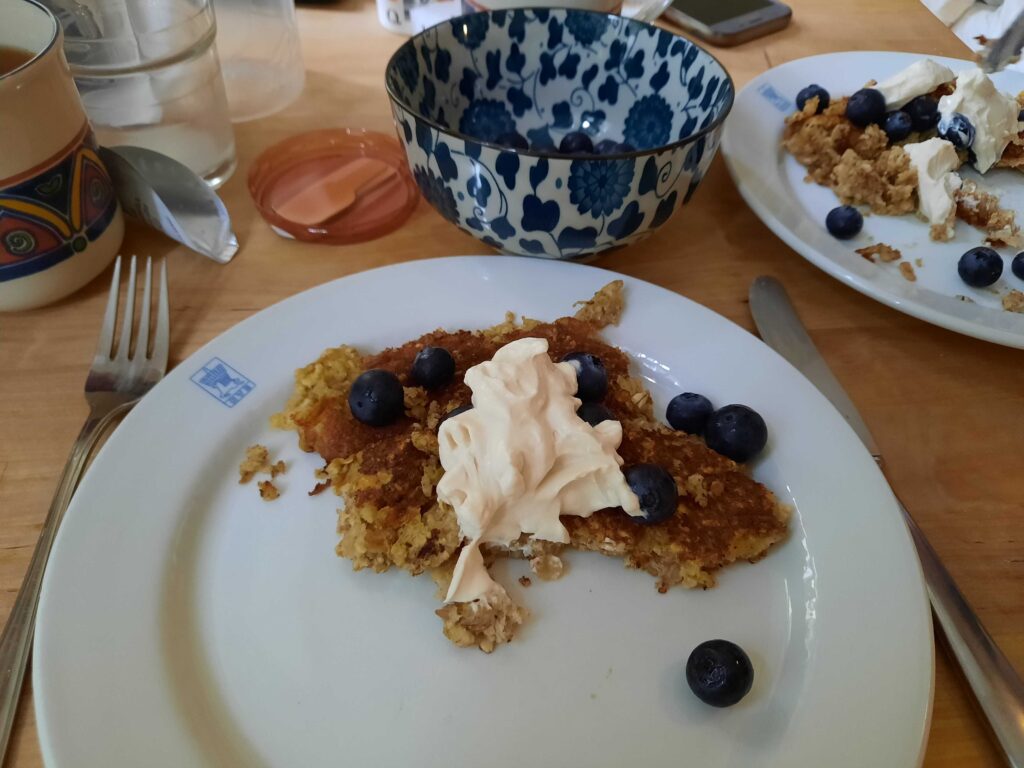 Na snídani byly v plánu opět lívance. Tedy variace na ně. Protože další boj s pánví jsem vzdal předem a měl v plánu vytvořit trhance mícháním. Nepovedlo se. Vznikla spíš taková sladká mícháná vajíčka s vločkami. Ovšem s jogurtem dost chutné a zasytilo nás to na dlouho. Ubytování jsme opustili v 11 a odevzdali klíče.