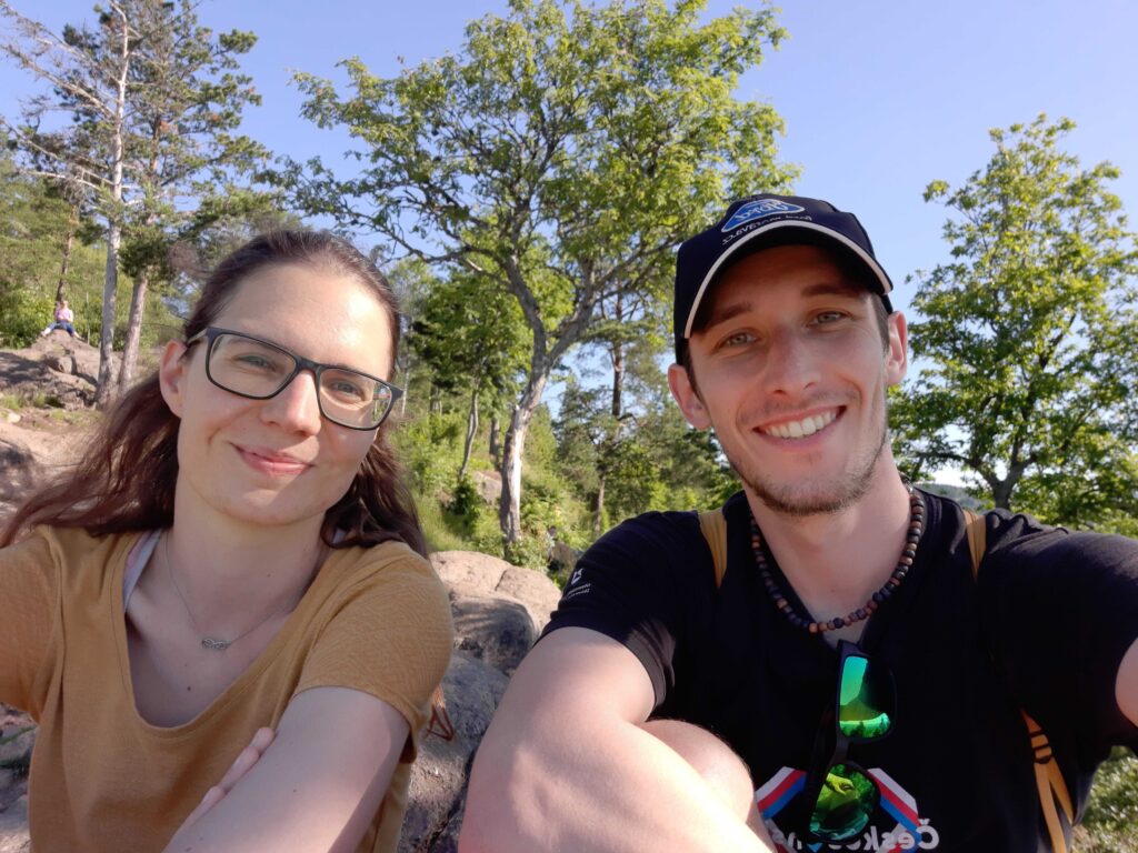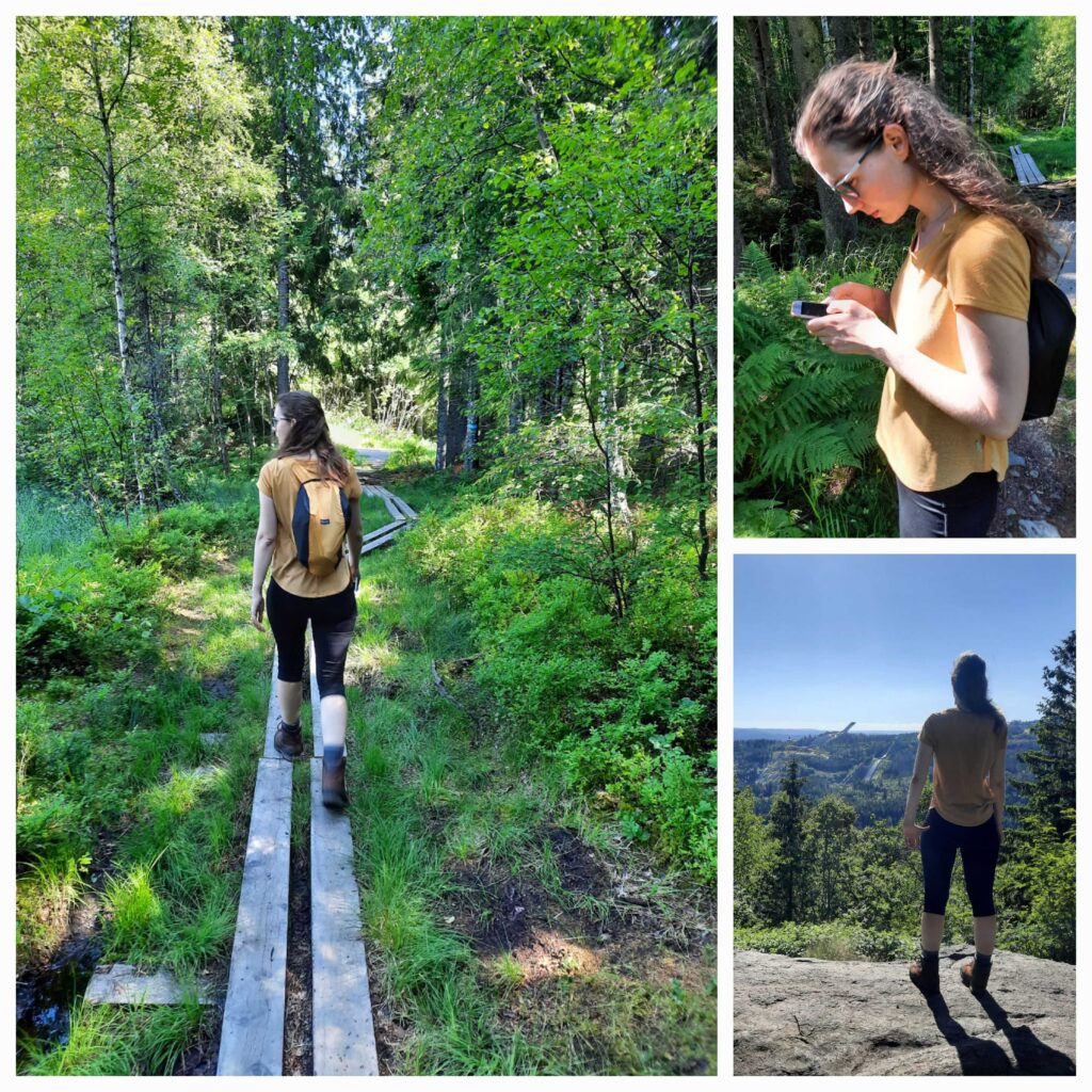 Museli jsme projít část lesem. Správná obuv a zelená barva najednou nějak seply a ze mě spadla veškerá únava (bohužel ji trochu přebrala Týna). Došli jsme na vrchol (Vettakollen) a taky ho přešli asi o 500 metrů. Měl tu být výhled a bylo tam prd. Ani jsme si nevšimli. No, tak snad ten druhý je ten správný. Došli jsme tam a ťukali se na čelo. Také žádný pořádný výhled. Nafotili jsme nějaké fotky a šli dál.