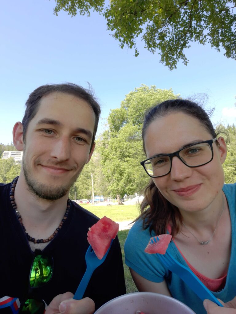 Po návratu do kempu jsme si koupili v Kiwi meloun a „pivo“. Je potřeba trochu doplnit vypocenou vodu. Meloun (i cider) baštíme u vody.