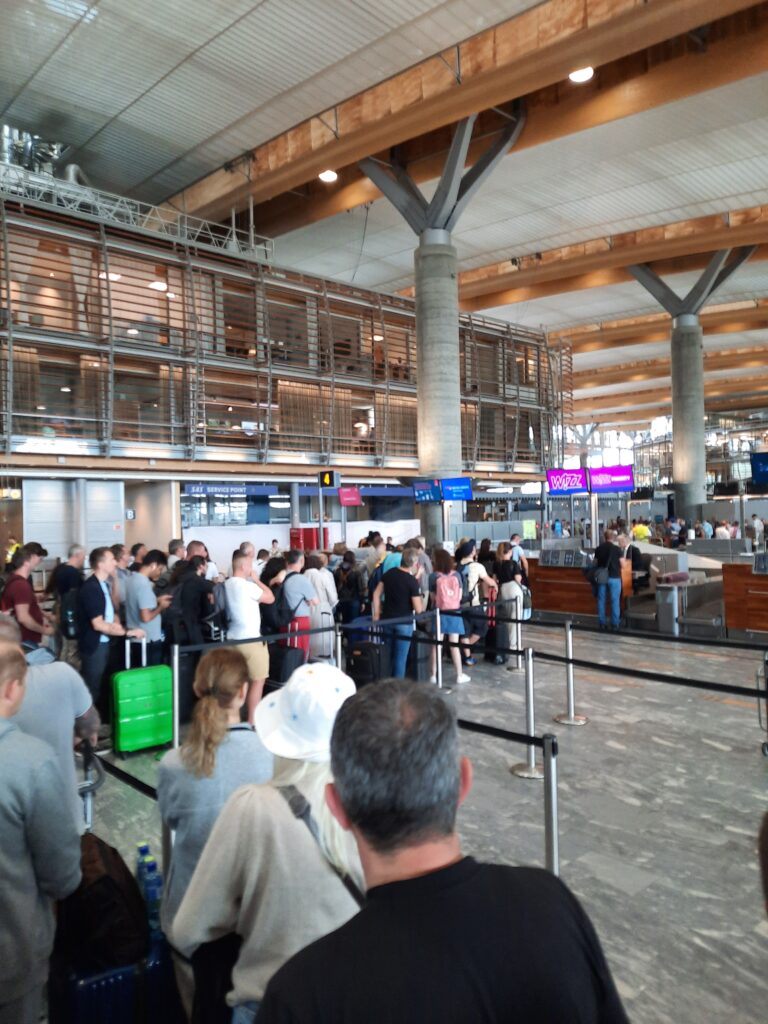 14:30 wizzair má službu, která dovoluje předností odbavení zavazadel. To nemáme zakoupené. Někteří lidé se snaží předběhnout frontu, protože priority mají, ale nedaří se, protože frontu má i priority. Wizzair očividně nezvládá, kolem fronty běhají zaměstnanci letiště, ale nemají jak pomoci, tak alespoň informují. Dav je nervózní.