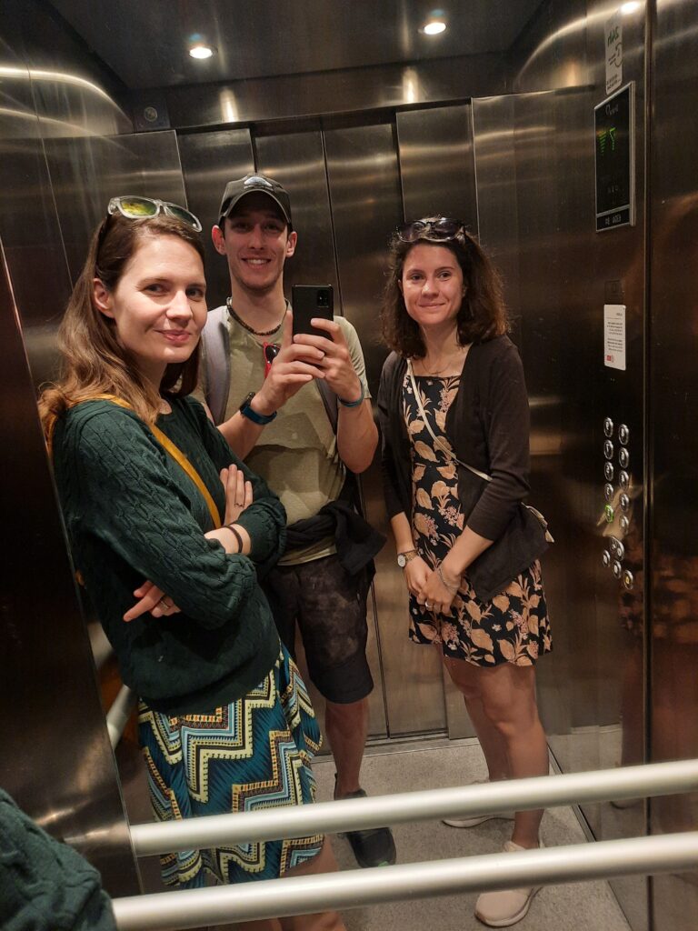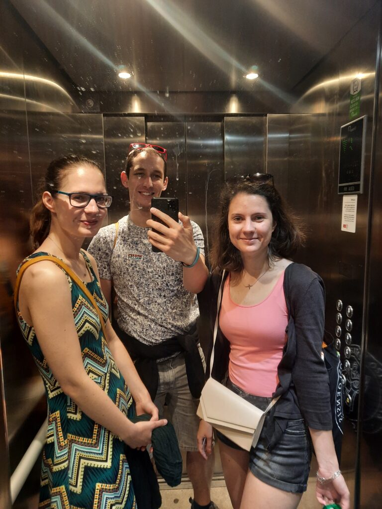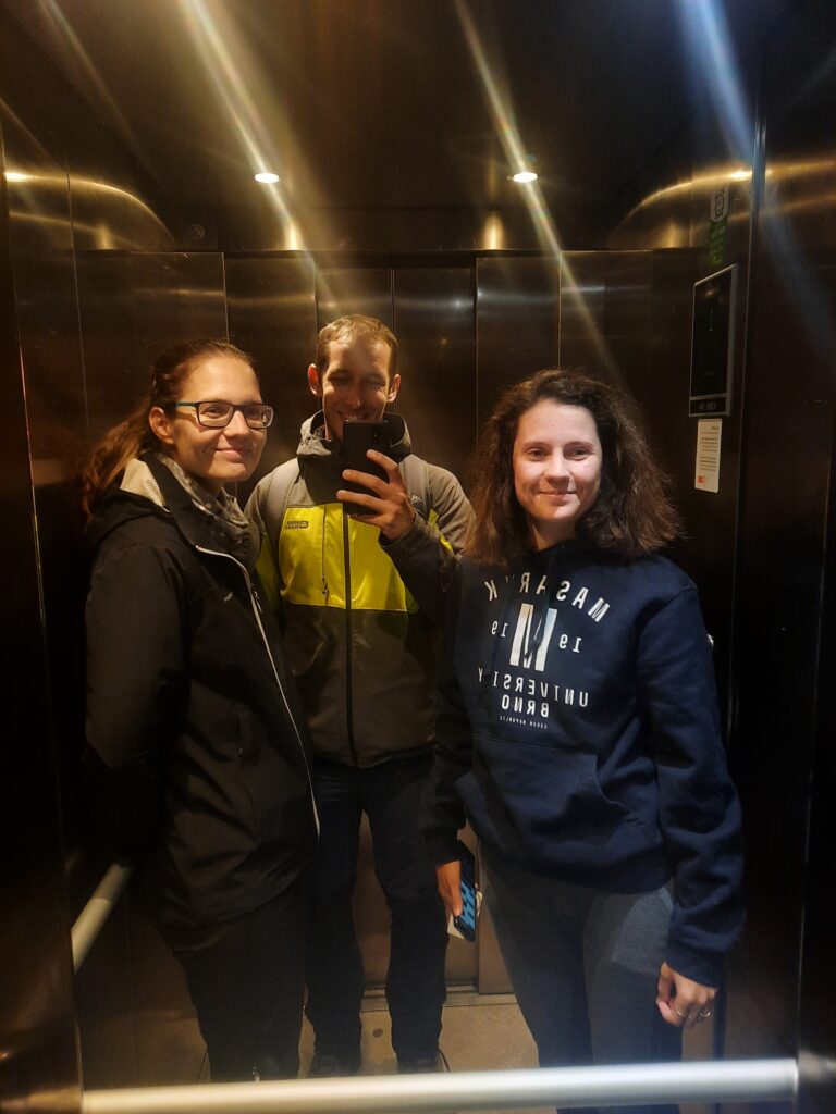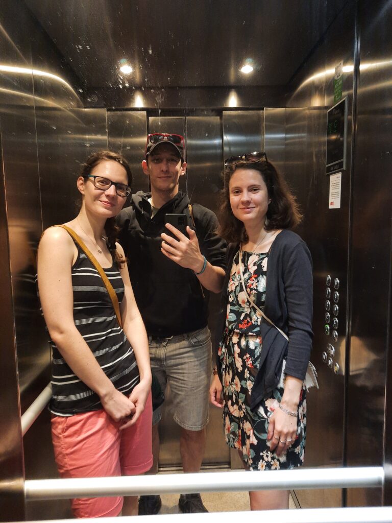 Ve stylu Mádi pořizujeme ve výtahu „výtahovku“ a začínáme prohlídku kampusu. Teda spíše nám jen Máďa popisuje, kde pere, kam nechodí cvičit a kde je nejbližší obchod. Zastávka metra je asi 5 minut daleko, takže super. Čekáme na nástupišti a mně je jasné, že i když jsem se dnes namazal, tak se v průběhu dne spálím. Sluníčko svítí jako pominuté a je pravda, že na něco takového teď opravdu nejsme zvyklí…