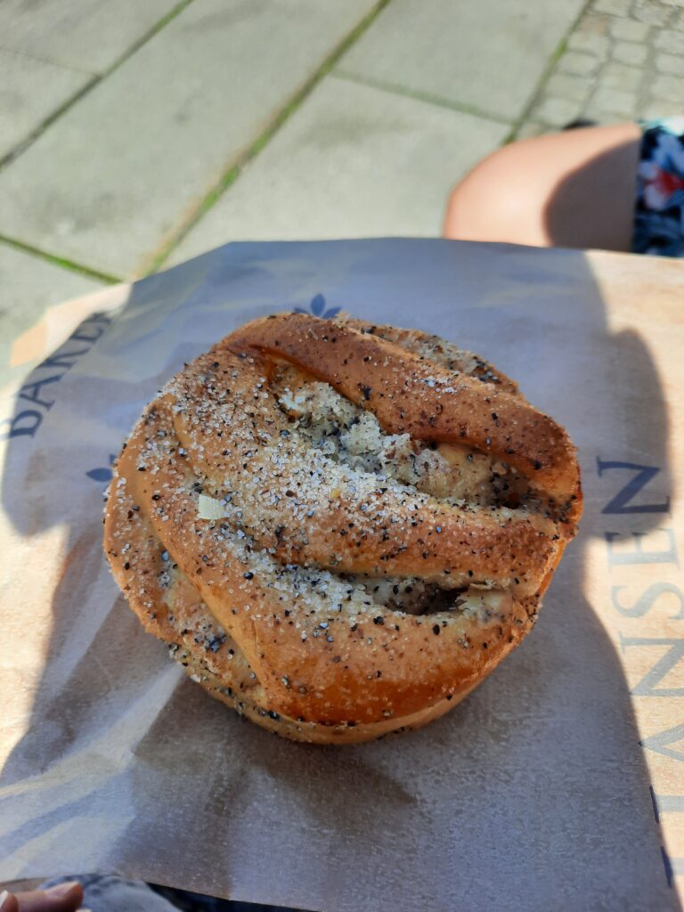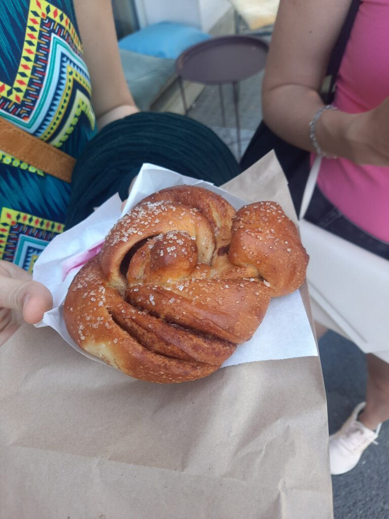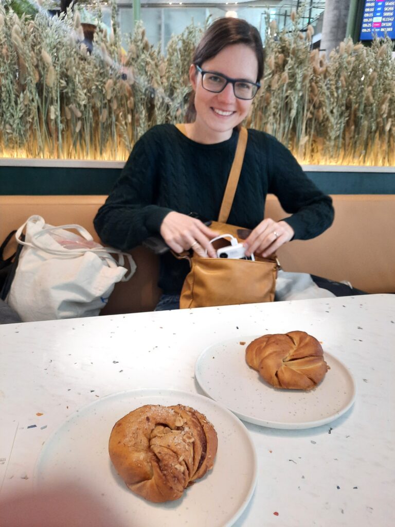 Na mě to působí jako místo pro bankéře, obchoďáky a frajery v oblecích, ale je tam opravdu pěkné prostředí. Došli jsme až do „naší“ vyzkoušené kavárny Apent Bakeri, kde jsme si koupili skořicového a kardamomového šneka a k tomu rozinkovou bulku na později.