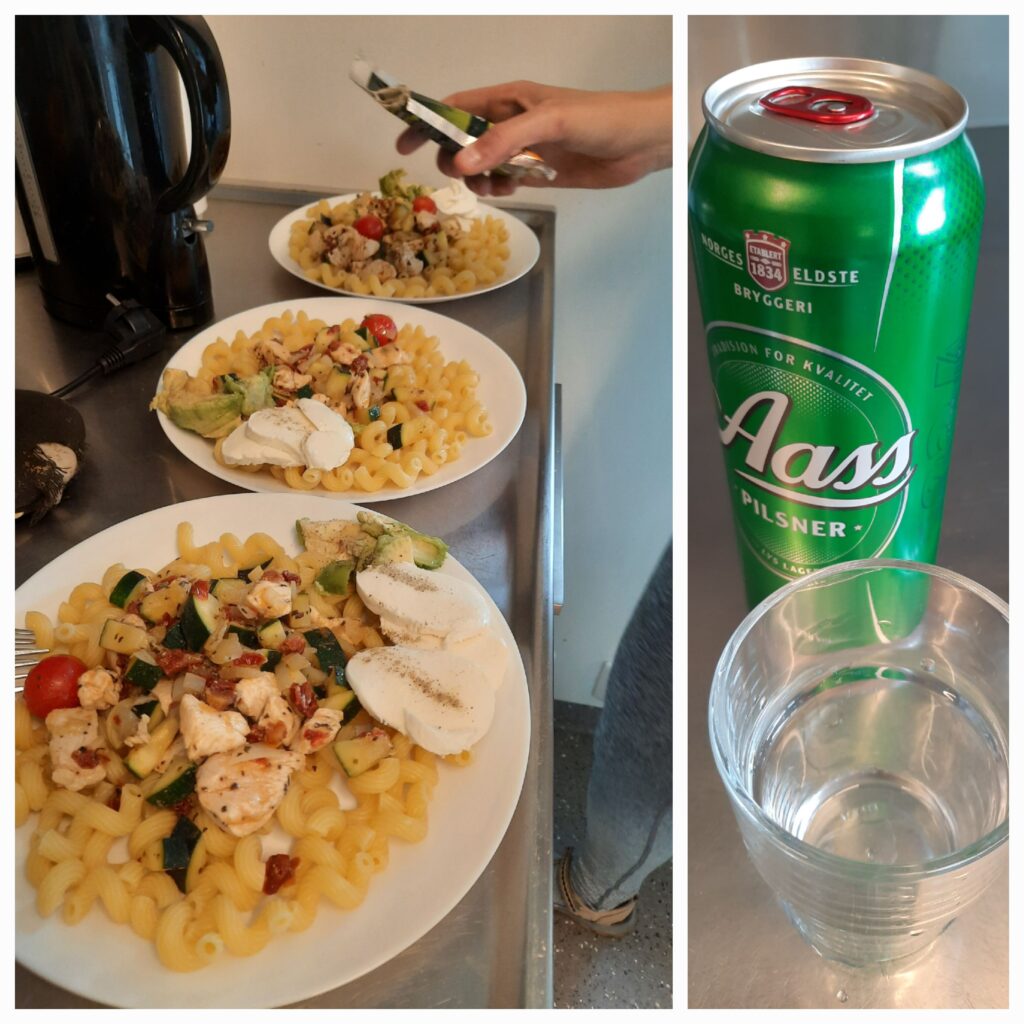 S plnými taškami jsme nasedli na metro a vystoupili na Majorstuen. Je tady druhé XXL, kde jsme bombičku konečně pořídili! Super. Museli jsme čekat 10 minut a konečně jsme dojeli na koleje. Když jsme přicházeli, tak na protějších kolejích zvonil alarm, ale Máďa říkala, že je to normální. Pak přijeli hasiči, alarm vypnuli a všichni hned naklusali zpět do ubytování. Na večeři jsme měli zbytky. Rýže, maso k těstovinám a lečo, co měla Máďa v pátek.