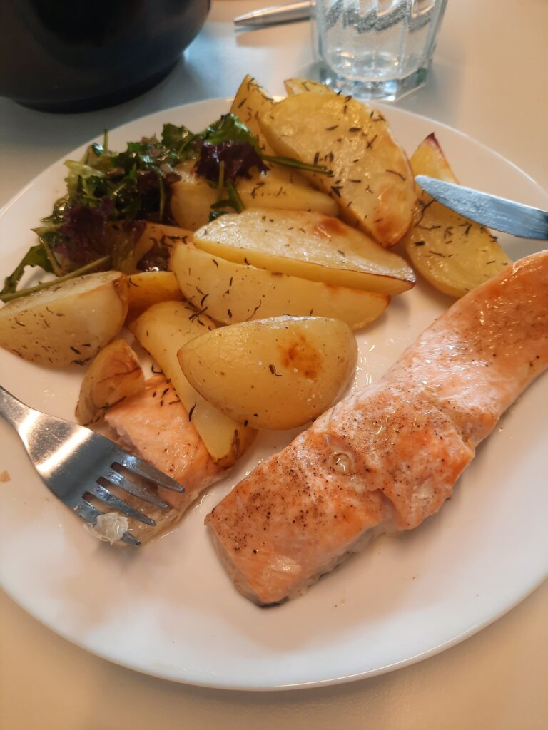Už docela unavení jsme došli k metru a s radostí nasedli. Ubytování je fakt kousek, což je super. Na pokoji jsme leželi déle než půl hodiny, než jsme se dali do vaření. Dneska to ale bude easy. Děláme pečené brambory s lososem. Máďa ještě udělala salát s dobrou zálivkou.