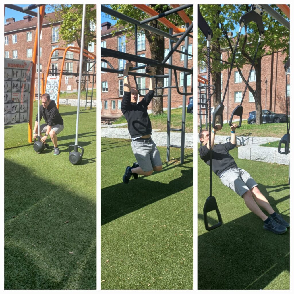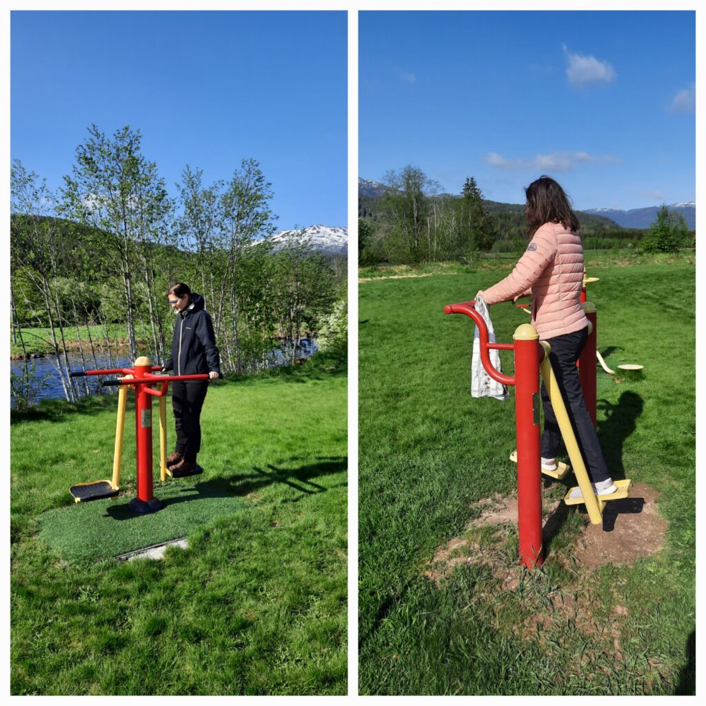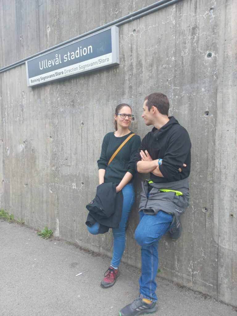 Nejeli jsme metrem, ale pěšky šli ke stadionu Ulleval stadion přes studentskou vesničku Sogn, kde bydlí Mádiny kamarádky. Jelikož tam bylo venkovní workout hřiště, nemohl jsem odolat.