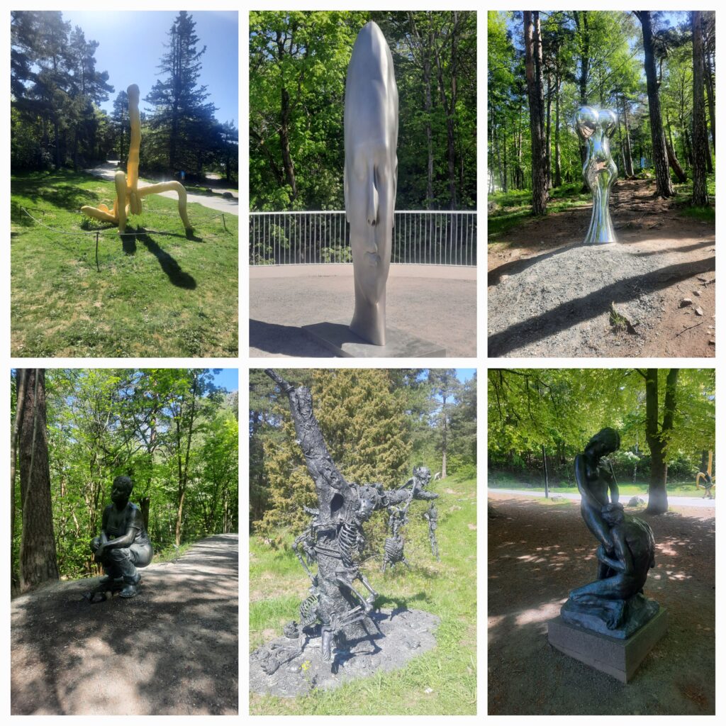 Na zastávce jsme sledovali lidi (ne nijak divně, jen byla sranda špekulovat, co kdo dělá), než přijela tramvaj. Tramvají číslo 19 jsme vyjeli do Ekeberk parku (teda, já tomu říkám Eke breke park, ale teď to říkají i holky a to se mi nelíbí). Tam jsme museli, protože tohle místo už navštívili Rosťa s Katkou, když tu za Máďou byli, tak aby i ona věděla, o co přišla. Za mě musím říct, že většina soch super, až na tu žlutou.