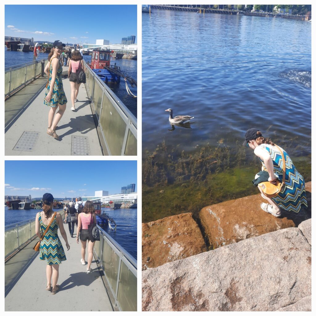 Do části Bjorvika jsme došli pěšky asi po 20 minutách. Cesta kolem silnice, ale i zde pěkně upravená. Dali jsme si krátkou pauzu mezi domy bez sluníčka. Dneska fakt pálí, takže se snažíme schovávat. Poté jdeme na plovoucí most, po kterém se chvílemi chodí dost divně, ale vlnky byly zrovna malé, takže ten efekt asi nebyl moc velký. Zároveň jsme dost překvapení, že kousek od Opery je prostor pláže, se skutečným pískem! Týna zkouší vodu a jako asi by to i šlo, ale radši jsme si plavky nevzali.