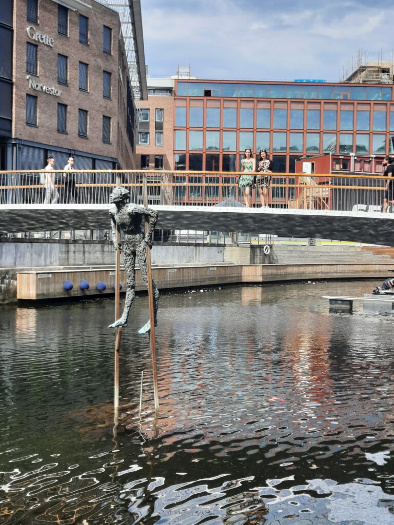 Z obchodů jsme vyrazili do čtvrti Aker Brygge, kde se nám už dřív s Týnou moc líbilo. Po cestě tam jsme si konečně splnili sen a dali si soft-is neboli točenou zmrzlinu. Holky s kakaovým práškem a já s něčím, co jsem později zjistil, že je karamel. Hodně karamelu na takovou porci. A člověk si to nemůže nechat na později, protože to hned teče. Pak jsme viděli sochu na chůdách a pokračovali jsme hlouběji do čtvrti.