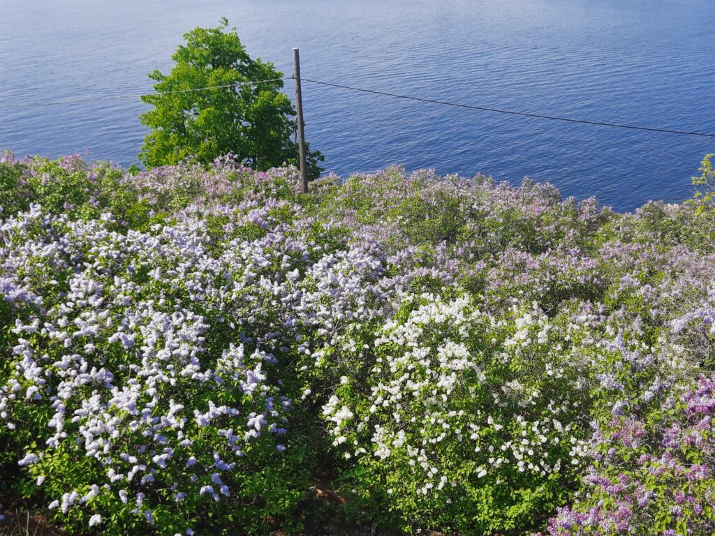 Vystoupili jsme na ostrově v hojném počtu a vyrazili na průzkum. V sobotu se holky bavily, že je Madle líto, že letos neuvidí kvést šeříky v Brně. Nemusí, na ostrově jich bylo plno.