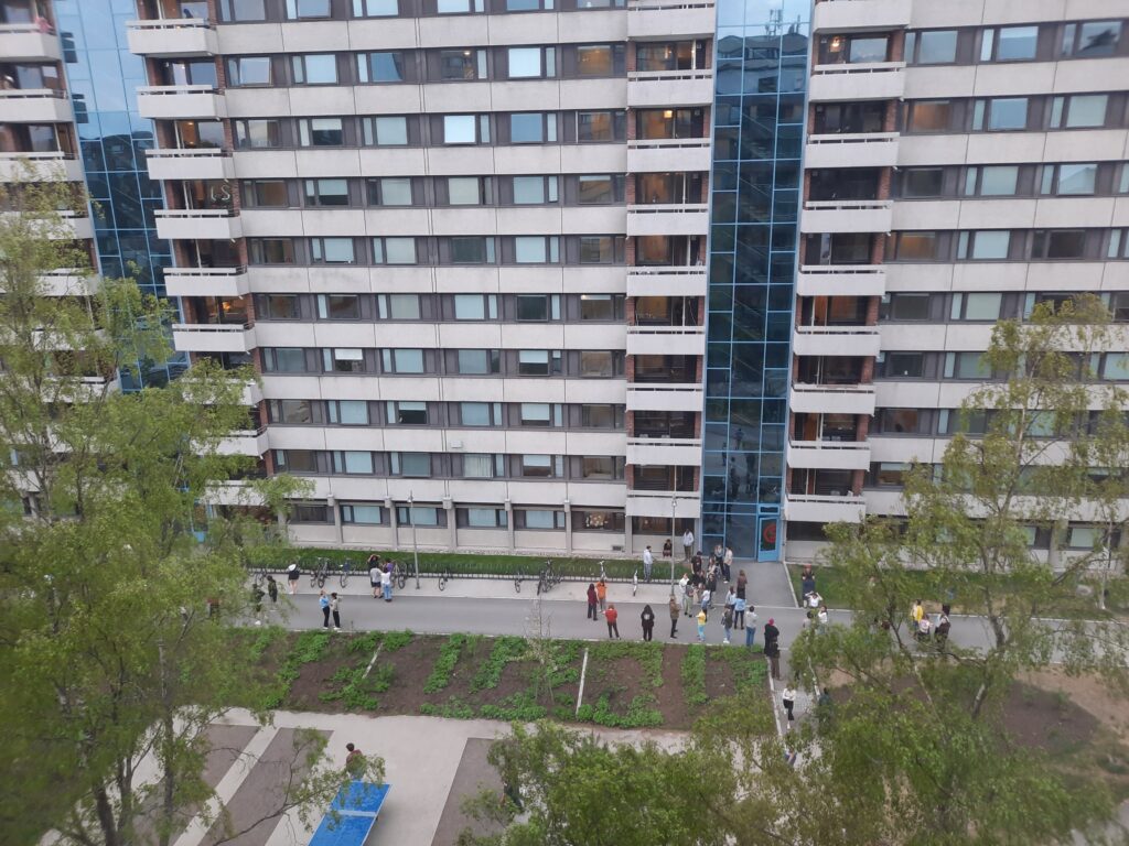 Asi o čtvrt na dvě jsme vyrazili směrem ke kampusu. Šli jsme pěšky kolem kolejí a krásnými domečky, které tu místní mají. Procházeli jsme kolem zahrádek, kde i chatky mají klasický vzhled červené budovy. Cesta nám zabrala asi 45 minut, což bylo akorát.