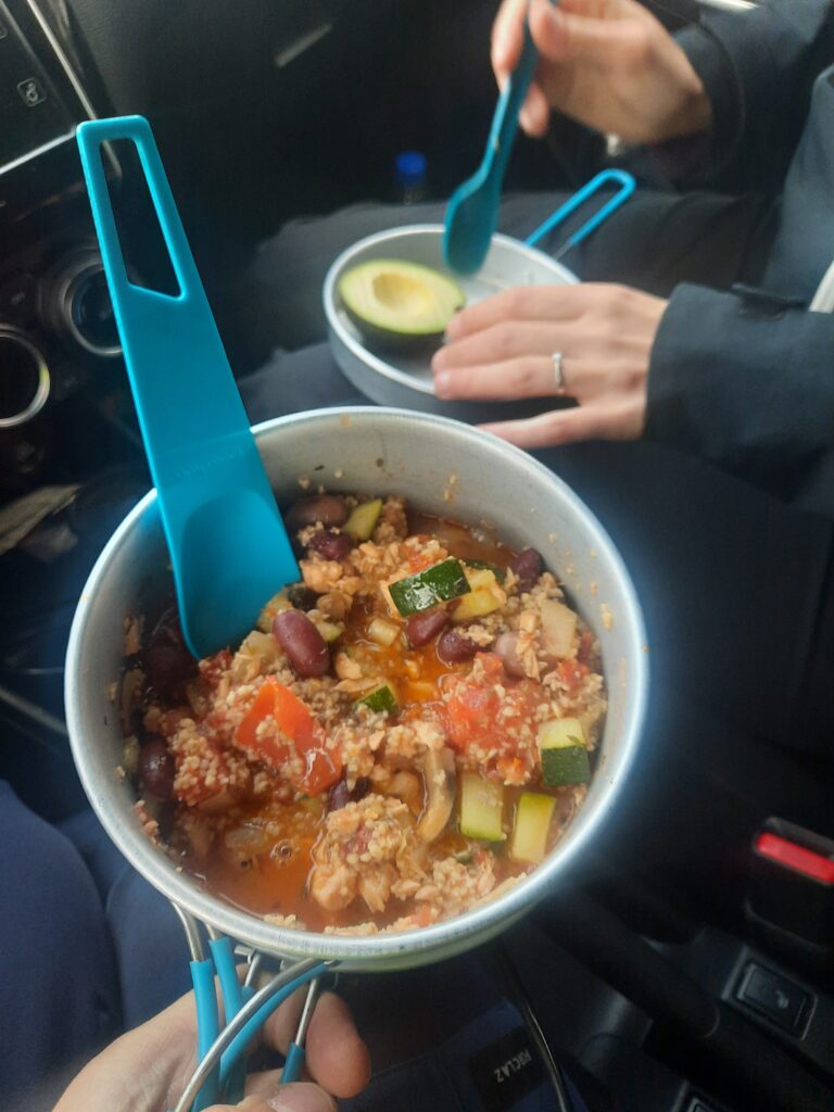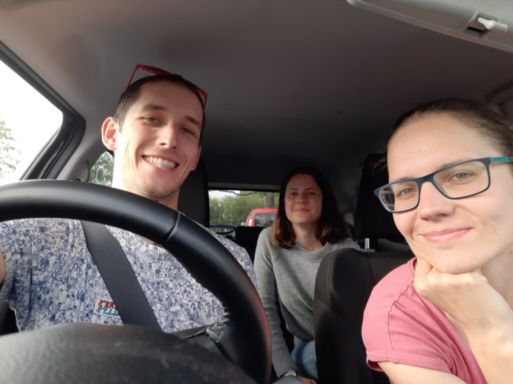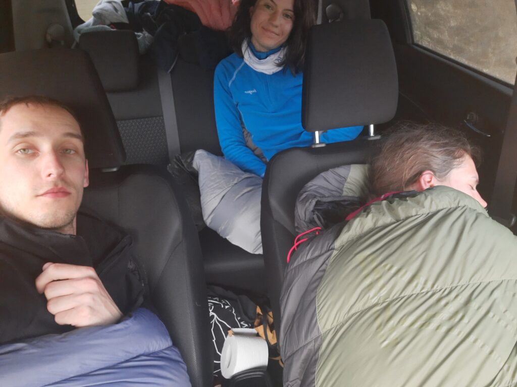 Na snídani máme vločky s jahodami a rozmačkaným banánem a k tomu čaj. Po snídani umýváme věci na záchodech teplou vodou, taky super. Nakonec sedíme v autě na odpočívadle. Madla se učí, Týna luští a já dopisuju včerejší den. V 10:20 jsem zavelel k odjezdu. Měl jsem dopsáno a fotky vybrány, předal jsem text k revizi Týně.