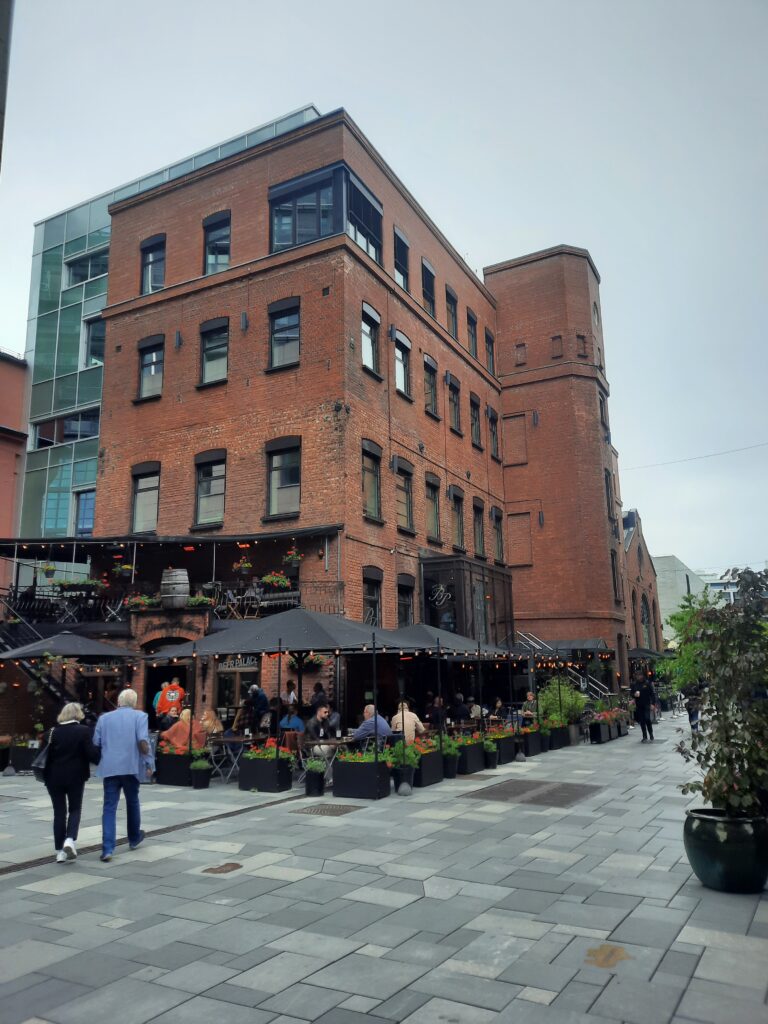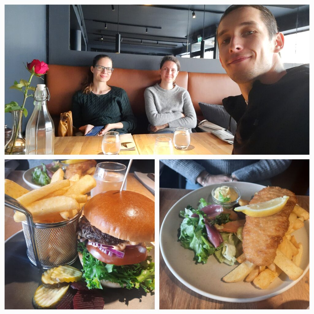 Tentokrát v části Gamlebyen, tedy v historickém centru. Máme trochu hlad, a tak začínáme hledat restauraci, protože na dnešek jsme naplánovali snad poslední velké plácnutí přes kapsu. Po několika pokusech nacházíme a usedáme. Místo je moc příjemné, i když obsluha trochu pokulhává. Máďa si objednává Fish and Chips, já „rybí“ burger a Týna chtěla palačinku, kterou samozřejmě neměli, takže také Fish and Chips. Můj rybí burgr se nakonec ukázal jako zvěřinový, což je důsledkem toho, že s Týnou neumíme číst. Ta „fisk“ (ryba) totiž byla „frisk“ (čerstvý – salát). No nic, ale dobrý byl.