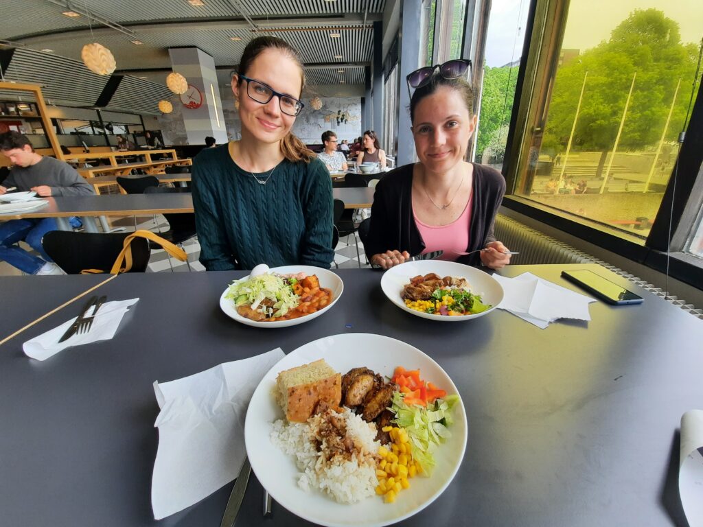 Našli jsme správnou budovu a dokonce i patro, pak už jsme jen čekali na Máďu. Od učebny jsme došli do menzy, kde jsme si dali různá jídla, podle chuti. Výběr je tu super, ale prý je každý týden stejný. Týna si moc chválila salátový bar, potom jsou na výběr vegetariánské možnosti (cena je pak levnější) a nakonec maso/ryby. Vsichni jsme si dali několik chilli kuřecích křidélek. Shodou okolností jsme se v menze potkali s Paulem, se kterým se Madla nikdy v menze nepotkala. Dobrá náhoda.
