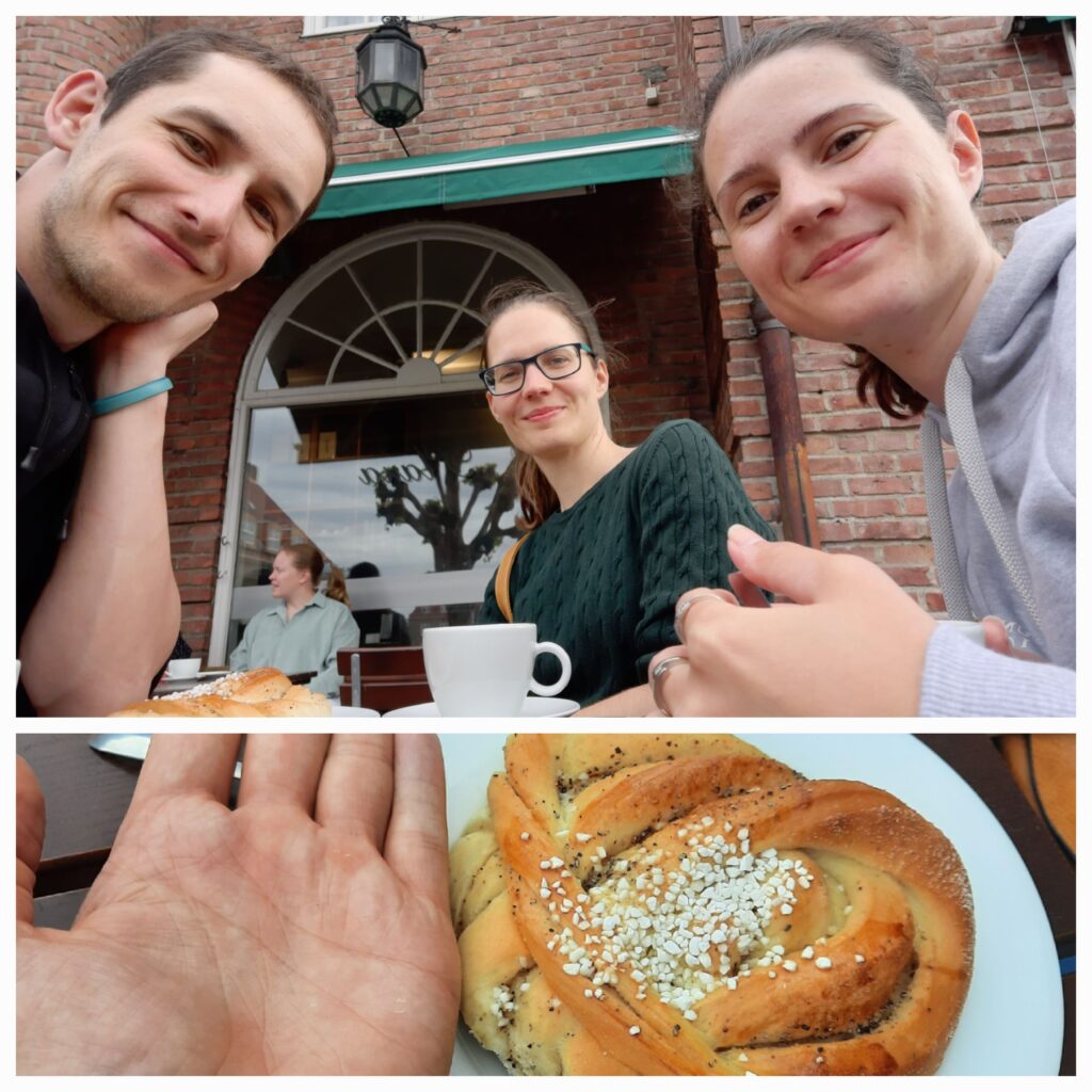Od univerzity jsme se vydali kampusem zpět, abychom navštívili Mádinu oblíbenou Åpent Bakeri, kde nás obsluhoval o 40 let mladší Arnošt Goldflam. Dali jsme si jednoho obřího kardamomového šneka a kafe.