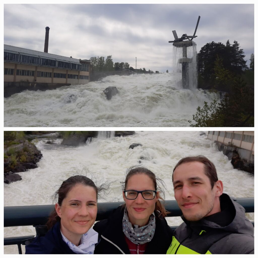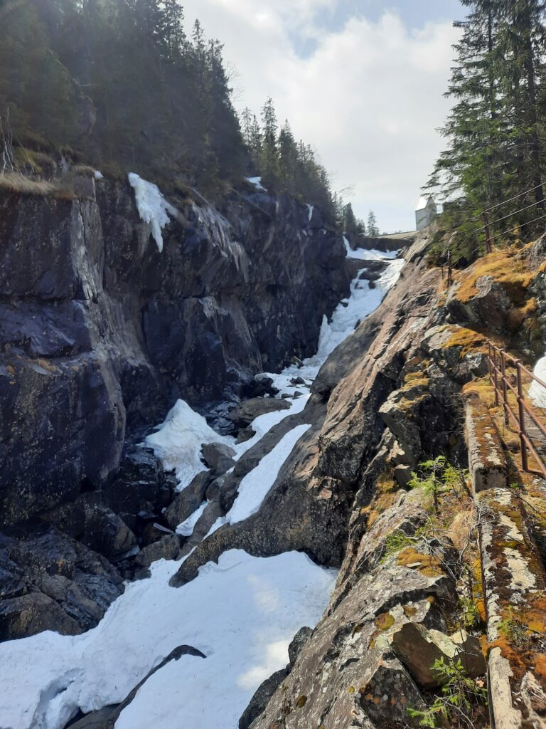 Sedáme do auta a loučíme se s poslední túrou, co jsme podnikli. Teď by to chtělo kávu a kannel v nějaké podobě. Zkusím najít na mapě nějaké kavárny a nacházím Esspresso House v Hønefoss. Takové trochu jiné Starbucks, ale pro naše účely snad dobré. Cesta tam opět trvá nějakých 40 minut. Když hledáme parkování v Hønefoss, projíždíme přes most nad hooodně rozbouřenou řekou. Je nám jasné, že po tom kafi se ještě musíme podívat.