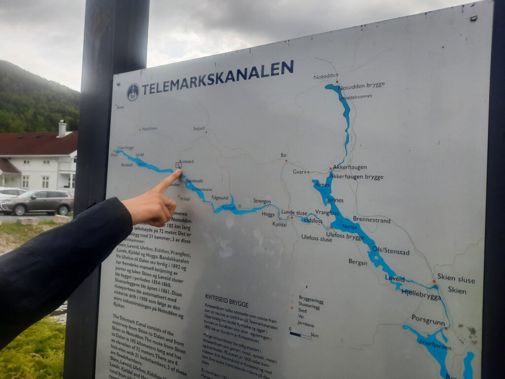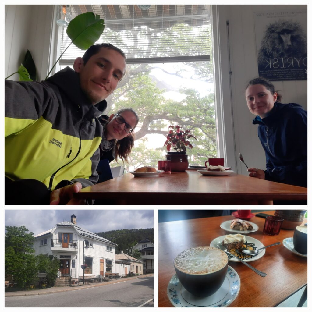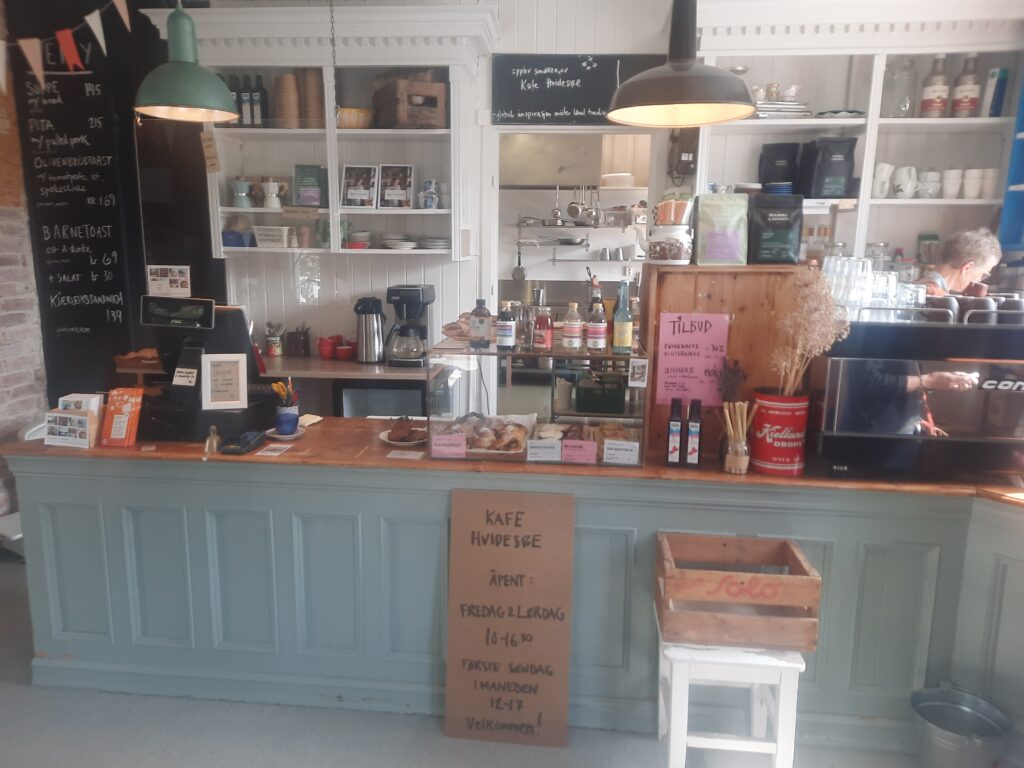 Zastavujeme ve městě Kviteseid a jdeme do kavárny Kafe Hvidesøe.