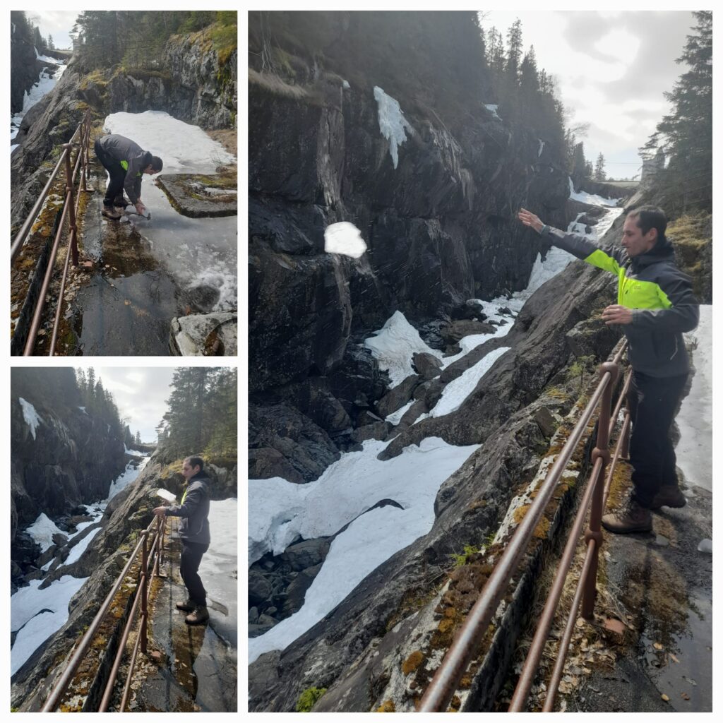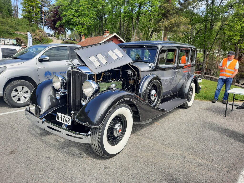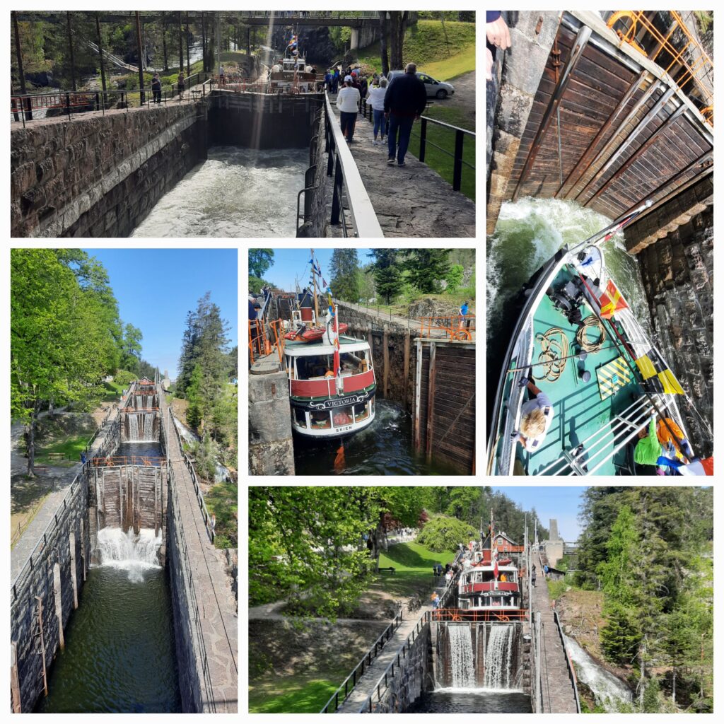 Z místa našeho spaní jsme vyrazili do Vrangfoss. Místo spaní jsme cíleně vybírali poblíž, takže to vůbec nebylo daleko. Za asi 5 minut jsme tam. Na tomto místě jsou poměrně známá zdymadla. Je jich celkem 5 v řadě a spojují města Dalen a Skien na trase cca 100 km. Při příjezdu na místo se mě jímá panika. U místa, kde chceme parkovat, stojí několik pánů v oranžových vestách, říkám si super, zase je zavřeno. Stahuji okénko a přijíždím k pánovi ve věku mého dědy (takže tak 85+) a zkouším, co nejameričtější „Helou!,“ aby bylo jasné, že jsem turista. Pak na mě koktavě, ale plynule spustil, že je zde výstava Mercedesů a máme projet za most a tam zaparkovat. Jinak se nemáme nechat nijak rušit a normálně se na zdymadla podívat. Pecka.