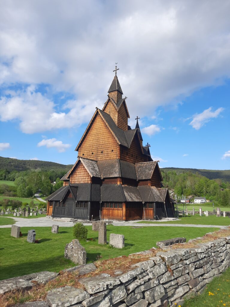 Jelikož jsme museli hodně změnit plány, z parkoviště u Gygrestolen jsme vyrazili do Heddal, kde je největší dochovaný kostel z doby přechodu pohanství na křesťanství. Bohužel už není otevřený, ale rozhodně jsme jej chtěli vidět. Podobný jsme totiž viděli loni ve skanzenu v Oslu, kam byl jiný kostel přestěhován. Je to jeden z 28 dochovaných kostelů tohoto druhu.