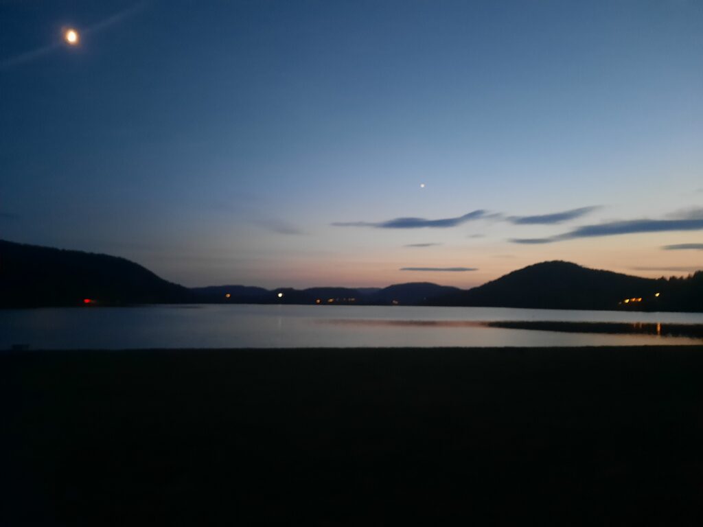 Nakonec nacházíme ještě další odstavné parkoviště, kde už stojí několik karavanů. Týna si pak všímá, že naproti přes vodu je další. Tady je plno, tak jedeme tam. Překvapuje nás, že parkování přiléhá k velké pláži, kde je povoleno stanování až na 3 dny. Super, takže stavíme stan a já o půlnoci pořizuji tuhle hezkou fotku.