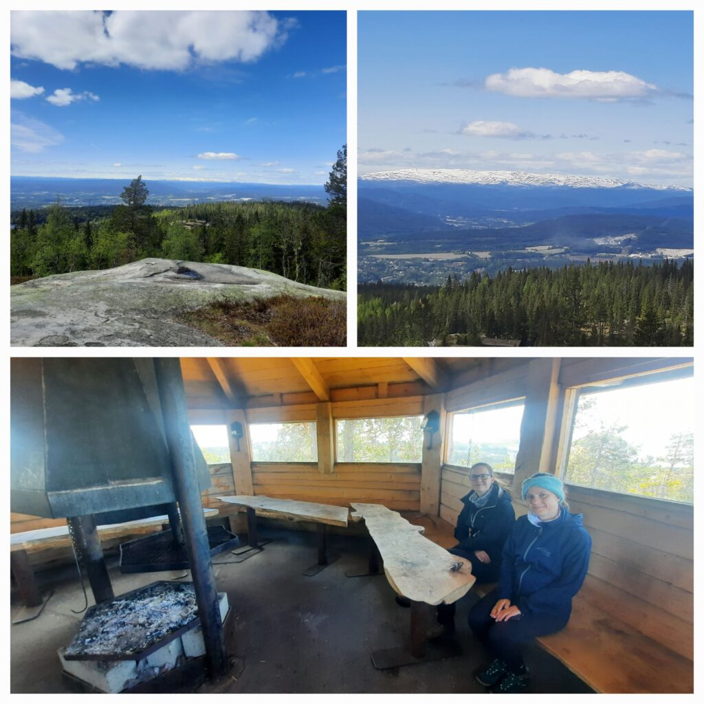 Na vrcholku svačíme připravené chleby a užívame si výhled. Dneska je moc hezky, a tak je nádherně vidět Gaustatoppen (z něj je vidět 1/6 Norska, takže je taky on vidět z 1/6 Norska. A z jeho tvaru je poznat hned).
