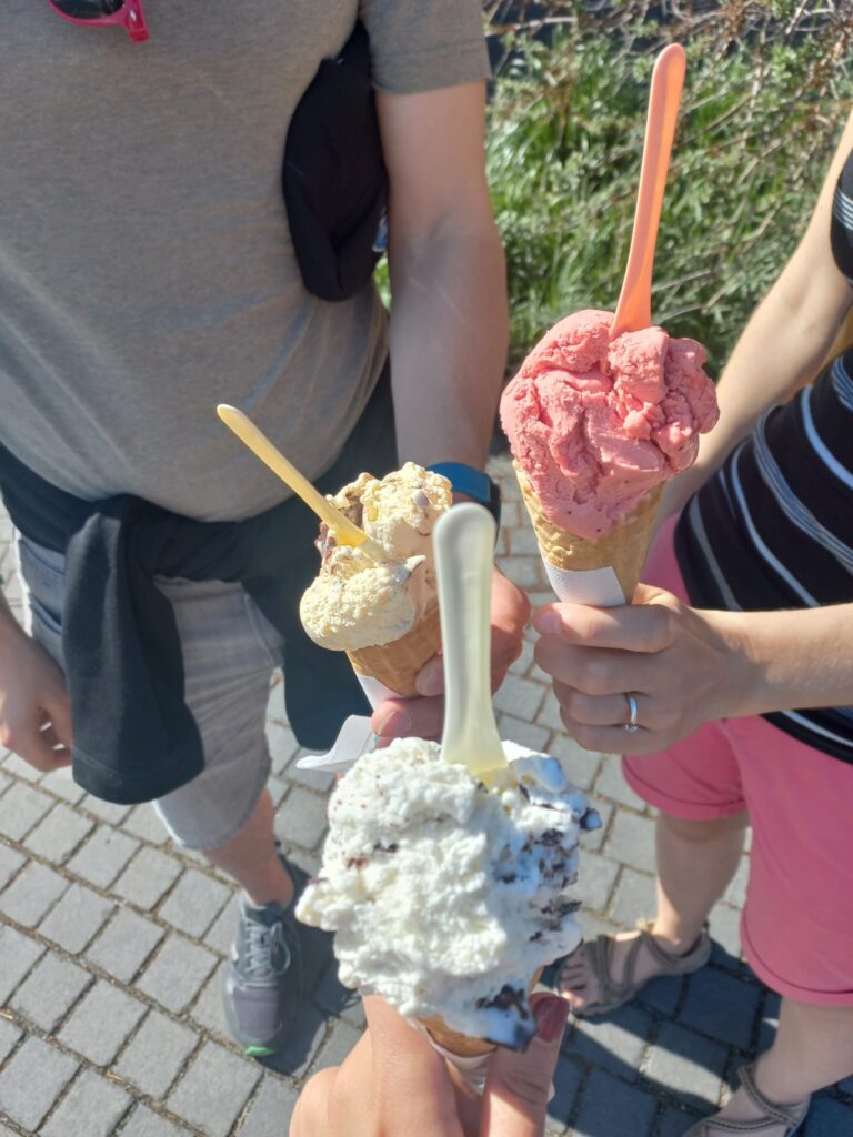 Využíváme záchod a jdeme dál. Je nám dost vedro, takže v plánu je zmrzka. Jdeme do místa, které Máďa už vyzkoušela a nelitujeme! Zmrzlina podle italského vzoru je výborná, to naznačuje i fronta. Potom si opět sedáme na molu a sledujeme Nory, jak si užívají „léto“ naplno a skáčou do vody nebo se jen sluní.