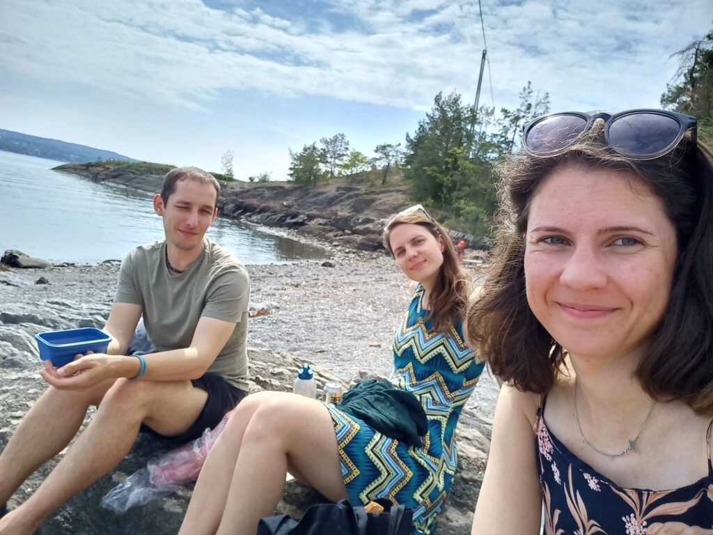 No, docela nás to nakoplo a zároveň dost přesladilo, takže na šneka jsme moc chuť neměli, ale dali jsme si. Pak jsme zase naskočili na trajekt a pokračovali v trase. Další zastávka byla asi za 30 minut, ale hrozně to uteklo. Zastavili jsme u ostrova Hovedøya a měli jsme jen hodinu času. Ostrov jsme prošli od severu k jihu a zpátky. Všude se někdo slunil nebo i koupal. Slunko pražilo pořádně a už to bylo nějaké náročné. Jsem rád, že v příštích dnech bude počasí trochu horší. Respektive, chtělo by to nějaké mráčky.