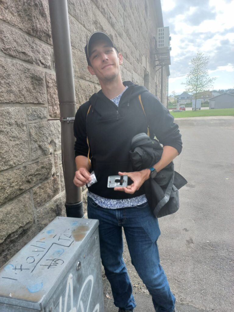 Poté míříme zpět k nádraží k autu. Ještě lovíme kešku. Máďa ji nachází hned.