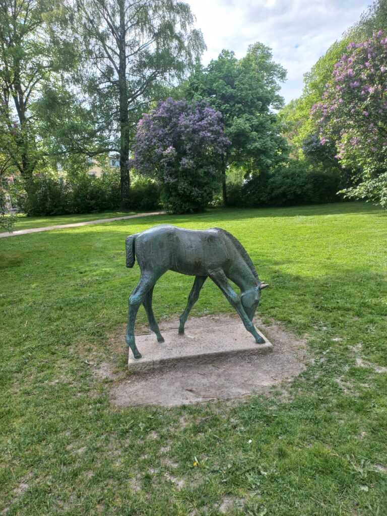 Uličkami města jsme prošli kolem soch a knihovny, potom k největšímu kostelu a přes hřbitov k Oslíkovi, který na nás poslušně čekal (na fotce je jen socha náhodného koníka, náš Oslík čekal na parkovišti).