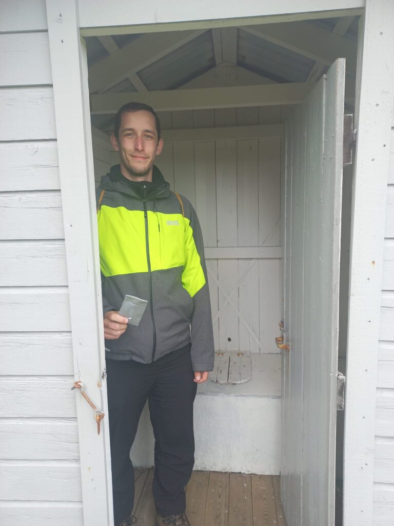 Na vrcholu jsme v podstatě hned, od parkoviště je to jen kousek. Přímo na vrcholu je postavená „útulna“, do které se jdeme schovat. Dokonce je možné tu i koupit dřevo přes Vipps, kdybychom si chtěli dělat oheň. Super nápad. Za 200 NOK to asi není špatná cena.