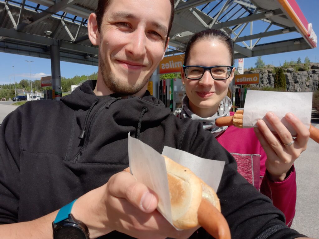 Když tedy nevyjde Gyrihaugen, tak volíme vrchol Ringkollen. Měla by tam být horská chata a asi jen 1 km na vrchol. Přejíždíme se zastávkou v Circle K, kde jsem chtěl tankovat, ale za 24 NOK, ne děkuji. Namísto toho si s Týnou dáváme vzpomínkový párek na benzínu u jezera loni.
