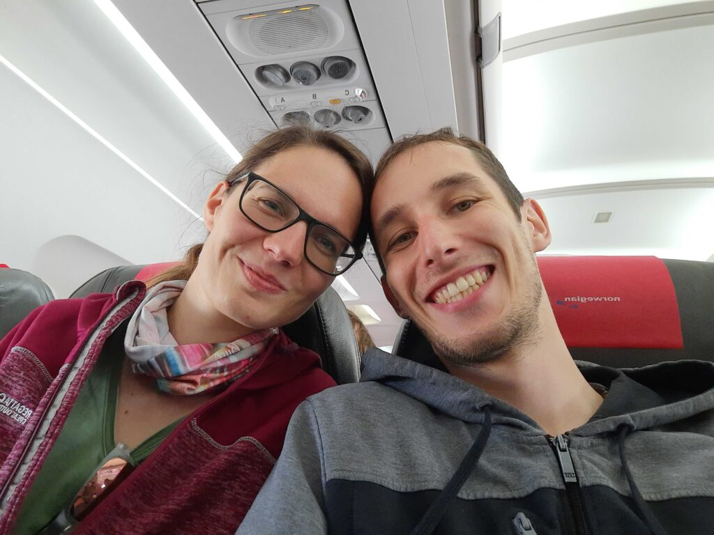 15:20 nasedáme do letadla. Wizzair je kámoš a za výběr sedaček se připlácí, což jsme nechtěli a nedělali ani u Norwegian (ti nás ale dali vedle sebe). Takže máme sedět v řadě 13 a 37. Naštěstí se se mnou slečna mění a sedíme vzadu spolu. Uf.